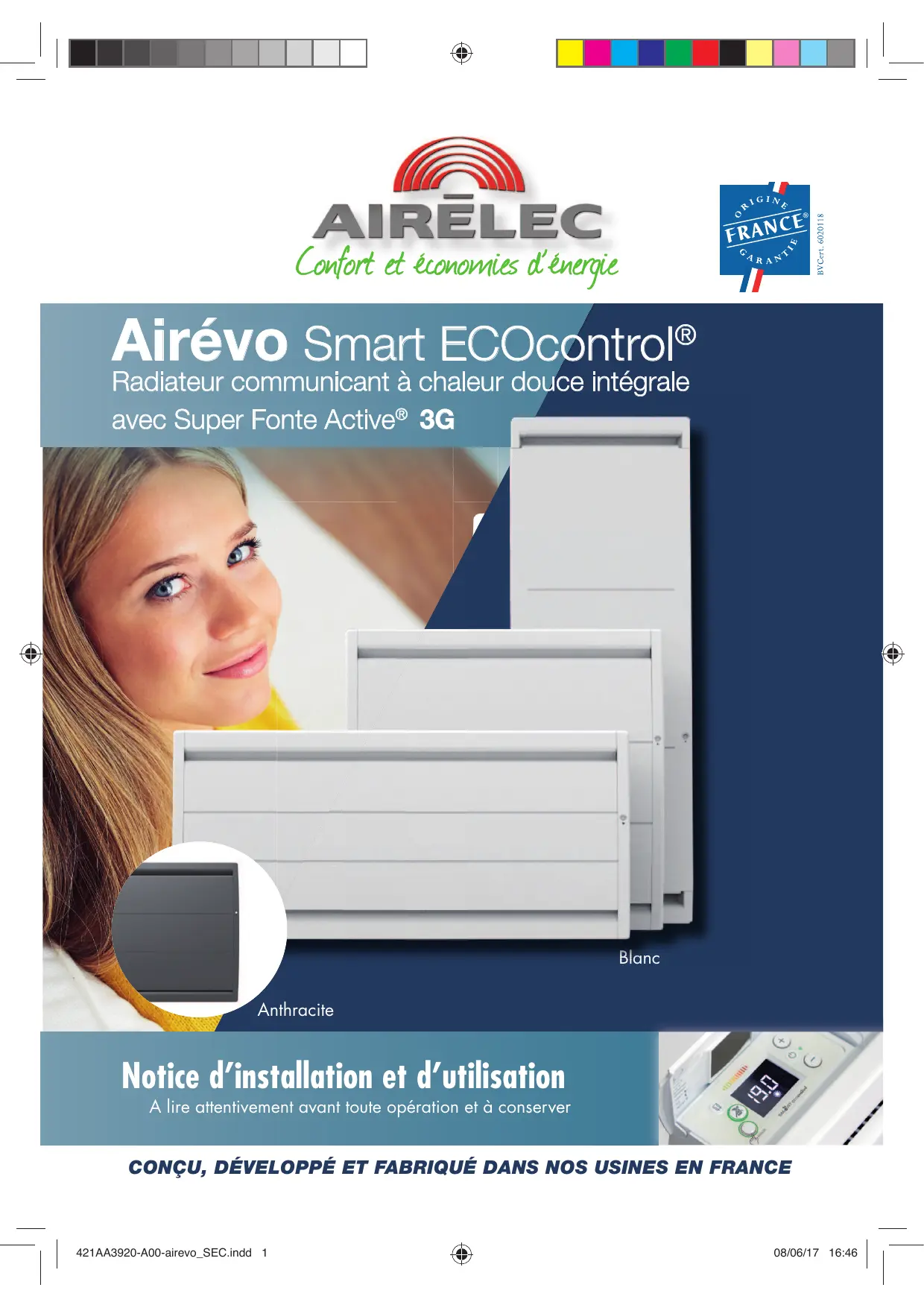 Airévo Smart ECOcontrol® Radiateur communicant à chaleur douce intégrale avec Super Fonte Active® 3G Blan Blanc anc Anthracite Notice d’installation et d’utilisation A lire attentivement avant toute opération et à conserver CONÇU, DÉVELOPPÉ ET FABRIQUÉ DANS NOS USINES EN FRANCE 421AA3920-A00-airevo_SEC.indd 1 08/06/17 16:46 Ce radiateur est compatible avec les modules de communication Smart ECOcontrol® qui rendent votre appareil connecté Découvrez tous les avantages que vous offrent les radiateurs connectés sur smart-ecocontrol.airelec.fr Insertion dans Notices.indd 3 2 421AA3920-A00-airevo_SEC.indd 08/07/2014 15:30 08/06/17 16:46 SOMMAIRE