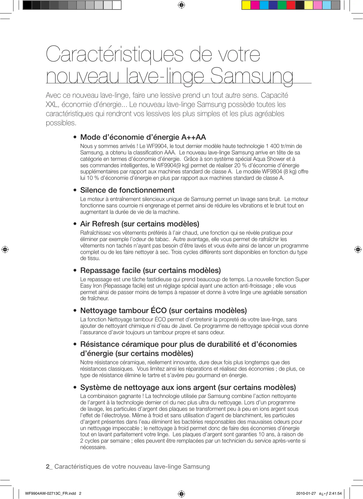 - Système de nettoyage aux ions argent (sur certains modèles) La combinaison gagnante ! La technologie utilisée par Samsung combine l’action nettoyante de l’argent à la technologie dernier cri du nec plus ultra du nettoyage. Lors d’un programme de lavage, les particules d’argent des plaques se transforment peu à peu en ions argent sous l’effet de l’électrolyse. Même à froid et sans utilisation d’agent de blanchiment, les particules d’argent présentes dans l’eau éliminent les bactéries responsables des mauvaises odeurs pour un nettoyage impeccable ; le nettoyage à froid permet donc de faire des économies d’énergie tout en lavant parfaitement votre linge. Les plaques d’argent sont garanties 10 ans, à raison de 2 cycles par semaine ; elles peuvent être remplacées par un technicien du service après-vente si nécessaire. 2_ Caractéristiques de votre nouveau lave-linge Samsung WF9904AW-02713C_FR.indd 2 2010-01-27 ø¿»ƒ 2:41:54