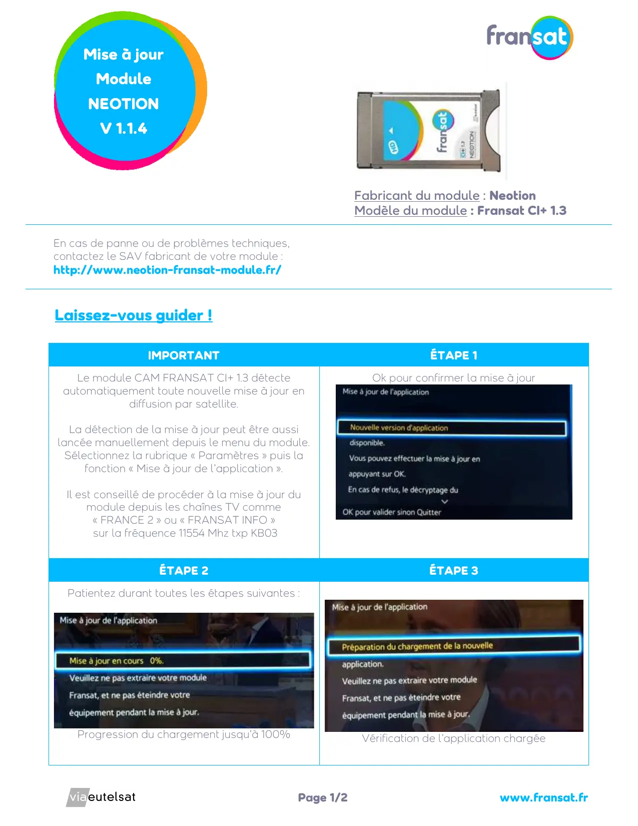 Il est conseilé de proceder à la mise à jour du module depuis les chaînes TV comme « FRANCE 2 » ou « FRANSAT INFO » sur la fréquence 11554 Mhz txp KB03