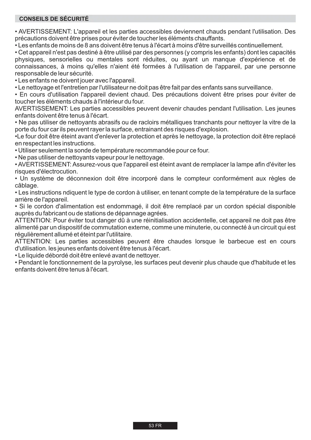- Pendant le fonctionnement de la pyrolyse, les surfaces peut devenir plus chaude que d'habitude et les enfants doivent être tenus à l'écart. 53 FR