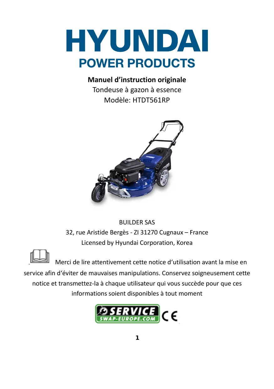Manuel d’instruction originale Tondeuse à gazon à essence Modèle: HTDT561RP BUILDER SAS 32, rue Aristide Bergès - ZI 31270 Cugnaux – France Licensed by Hyundai Corporation, Korea Merci de lire attentivement cette notice d‘utilisation avant la mise en service afin d‘éviter de mauvaises manipulations. Conservez soigneusement cette notice et transmettez-la à chaque utilisateur qui vous succède pour que ces informations soient disponibles à tout moment