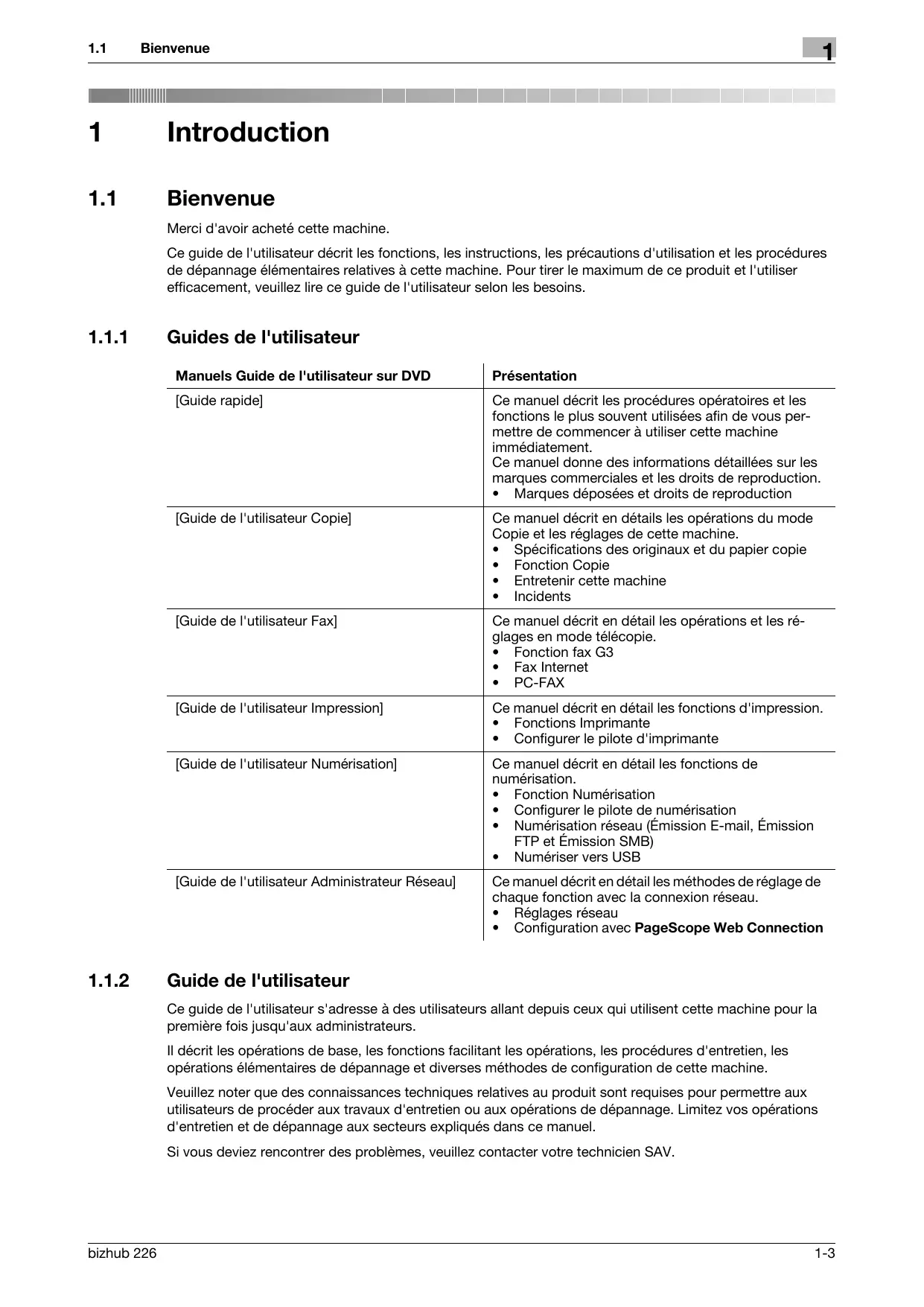 - Configuration avec PageScope Web Connection Guide de l'utilisateur Ce guide de l'utilisateur s'adresse à des utilisateurs allant depuis ceux qui utilisent cette machine pour la première fois jusqu'aux administrateurs. Il décrit les opérations de base, les fonctions facilitant les opérations, les procédures d'entretien, les opérations élémentaires de dépannage et diverses méthodes de configuration de cette machine. Veuillez noter que des connaissances techniques relatives au produit sont requises pour permettre aux utilisateurs de procéder aux travaux d'entretien ou aux opérations de dépannage. Limitez vos opérations d'entretien et de dépannage aux secteurs expliqués dans ce manuel. Si vous deviez rencontrer des problèmes, veuillez contacter votre technicien SAV. bizhub 226 1-3 Conventions utilisées dans ce manuel