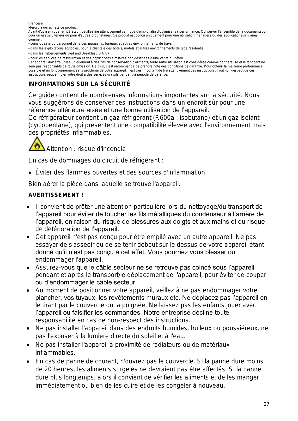 Francese Merci d'avoir acheté ce produit. Avant d'utiliser votre réfrigérateur, veuillez lire attentivement ce mode d'emploi afin d'optimiser sa performance. Conserver l'ensemble de la documentation pour un usage ultérieur ou pour d'autres propriétaires. Ce produit est conçu uniquement pour une utilisation ménagère ou des applications similaires comme : - coins-cuisine du personnel dans des magasins, bureaux et autres environnements de travail ; - dans les exploitations agricoles, pour la clientèle des hôtels, motels et autres environnements de type résidentiel - dans les hébergements Bed and Breakfast (B & B) - pour les services de restauration et des applications similaires non destinées à une vente au détail. Cet appareil doit être utilisé uniquement à des fins de conservation d'aliments, toute autre utilisation est considérée comme dangereuse et le fabricant ne sera pas responsable de toute omission. De plus, il est recommandé de prendre note des conditions de garantie. Pour obtenir la meilleure performance possible et un fonctionnement sans problème de votre appareil, il est très important de lire attentivement ces instructions. Tout non-respect de ces instructions peut annuler votre droit à des services gratuits pendant la période de garantie. Ce guide contient de nombreuses informations importantes sur la sécurité. Nous vous suggérons de conserver ces instructions dans un endroit sûr pour une référence ultérieure aisée et une bonne utilisation de l’appareil. Ce réfrigérateur contient un gaz réfrigérant (R600a : isobutane) et un gaz isolant (cyclopentane), qui présentent une compatibilité élevée avec l'environnement mais des propriétés inflammables. Attention : risque d'incendie En cas de dommages du circuit de réfrigérant :