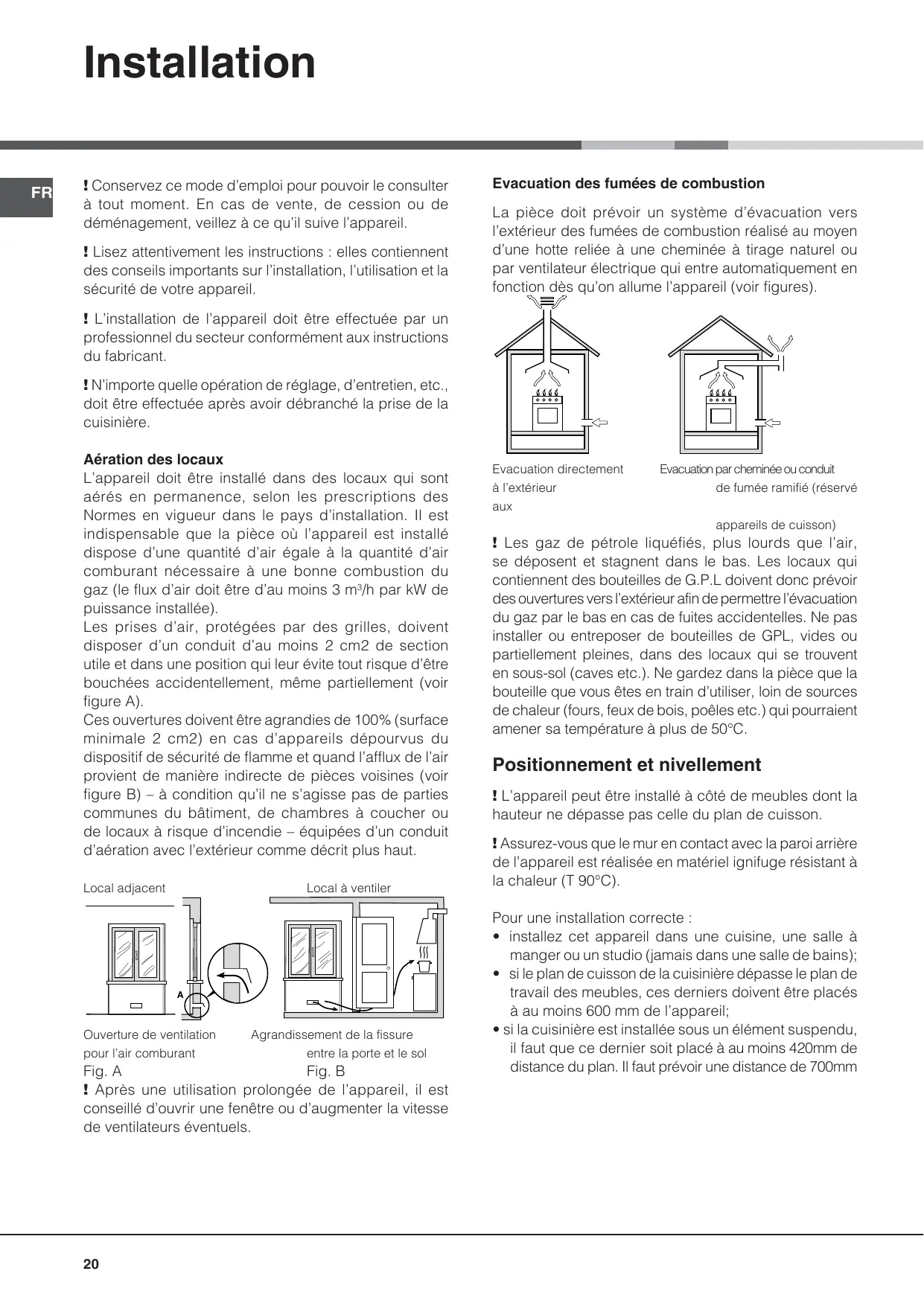 ! N’importe quelle opération de réglage, d’entretien, etc., doit être effectuée après avoir débranché la prise de la cuisinière. Aération des locaux L’appareil doit être installé dans des locaux qui sont aérés en permanence, selon les prescriptions des Normes en vigueur dans le pays d’installation. Il est indispensable que la pièce où l’appareil est installé dispose d’une quantité d’air égale à la quantité d’air comburant nécessaire à une bonne combustion du gaz (le flux d’air doit être d’au moins 3 m3/h par kW de puissance installée). Les prises d’air, protégées par des grilles, doivent disposer d’un conduit d’au moins 2 cm2 de section utile et dans une position qui leur évite tout risque d’être bouchées accidentellement, même partiellement (voir figure A). Ces ouvertures doivent être agrandies de 100% (surface minimale 2 cm2) en cas d’appareils dépourvus du dispositif de sécurité de flamme et quand l’afflux de l’air provient de manière indirecte de pièces voisines (voir figure B) – à condition qu’il ne s’agisse pas de parties communes du bâtiment, de chambres à coucher ou de locaux à risque d’incendie – équipées d’un conduit d’aération avec l’extérieur comme décrit plus haut. Local adjacent