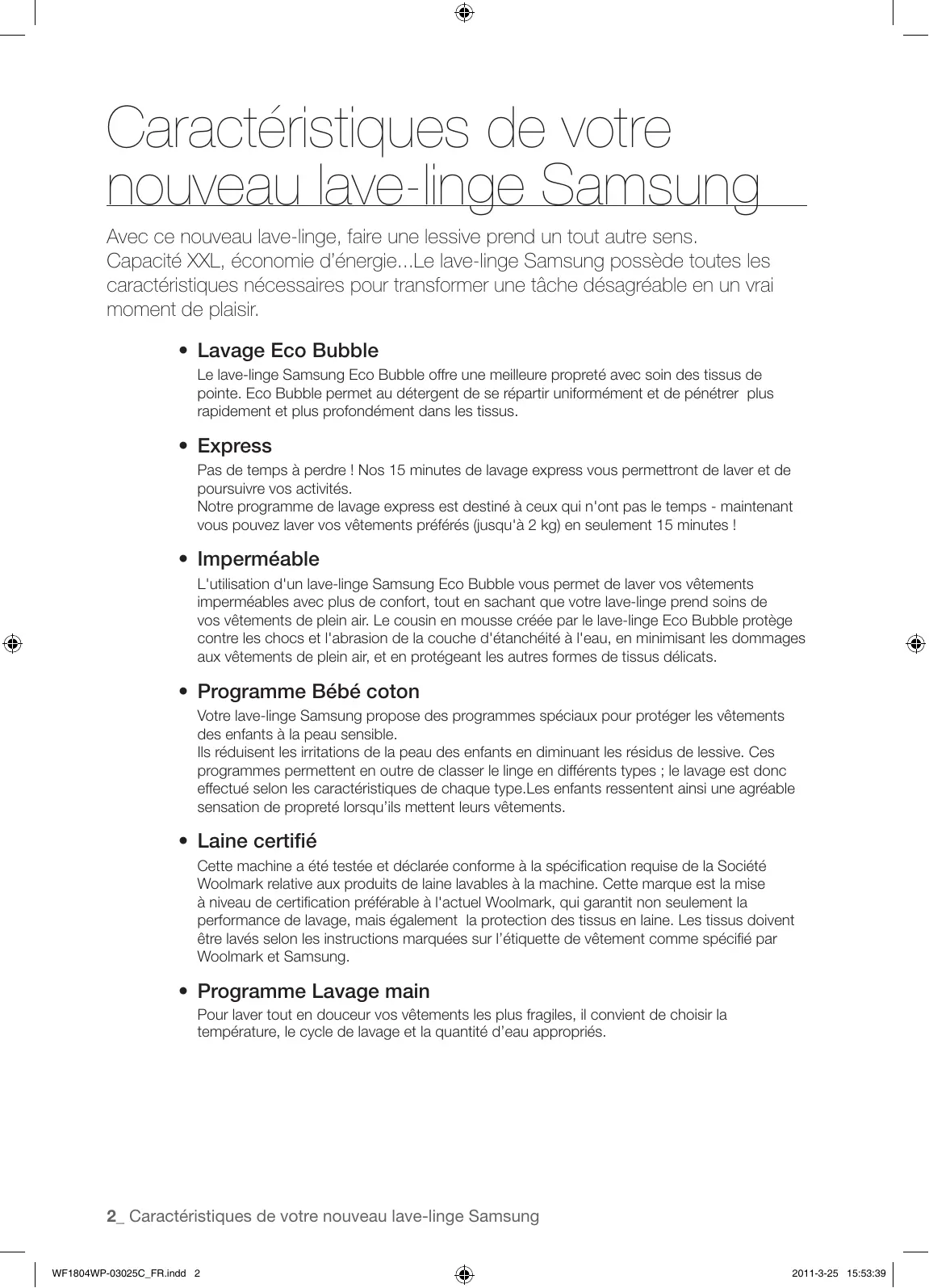 - Programme Lavage main Pour laver tout en douceur vos vêtements les plus fragiles, il convient de choisir la température, le cycle de lavage et la quantité d’eau appropriés. 2_ Caractéristiques de votre nouveau lave-linge Samsung WF1804WP-03025C_FR.indd 2 2011-3-25 15:53:39