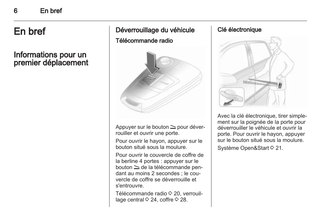 En bref En bref Déverrouillage du véhicule Clé électronique Télécommande radio Informations pour un premier déplacement Appuyer sur le bouton q pour déver‐ rouiller et ouvrir une porte. Pour ouvrir le hayon, appuyer sur le bouton situé sous la moulure. Pour ouvrir le couvercle de coffre de la berline 4 portes : appuyer sur le bouton q de la télécommande pen‐ dant au moins 2 secondes ; le cou‐ vercle de coffre se déverrouille et s'entrouvre. Télécommande radio 3 20, verrouil‐ lage central 3 24, coffre 3 28. Avec la clé électronique, tirer simple‐ ment sur la poignée de la porte pour déverrouiller le véhicule et ouvrir la porte. Pour ouvrir le hayon, appuyer sur le bouton situé sous la moulure. Système Open&Start 3 21. En bref Réglage des sièges Dossiers de siège Hauteur de siège Tourner la molette. Ne pas s'appuyer sur le dossier pendant le réglage. Réglage des sièges 3 49, position du siège 3 49, rabattement du dos‐ sier du siège passager avant 3 52. Mouvement de pompage du levier vers le haut = plus haut vers le bas = plus bas Position du siège Tirer la poignée, déplacer le siège et relâcher la poignée. Réglage des sièges 3 49, position du siège 3 49. 9 Danger Ne pas s'asseoir à moins de 25 cm du volant afin de permettre un dé‐ ploiement sûr de l'airbag. Réglage des sièges 3 49, position du siège 3 49.