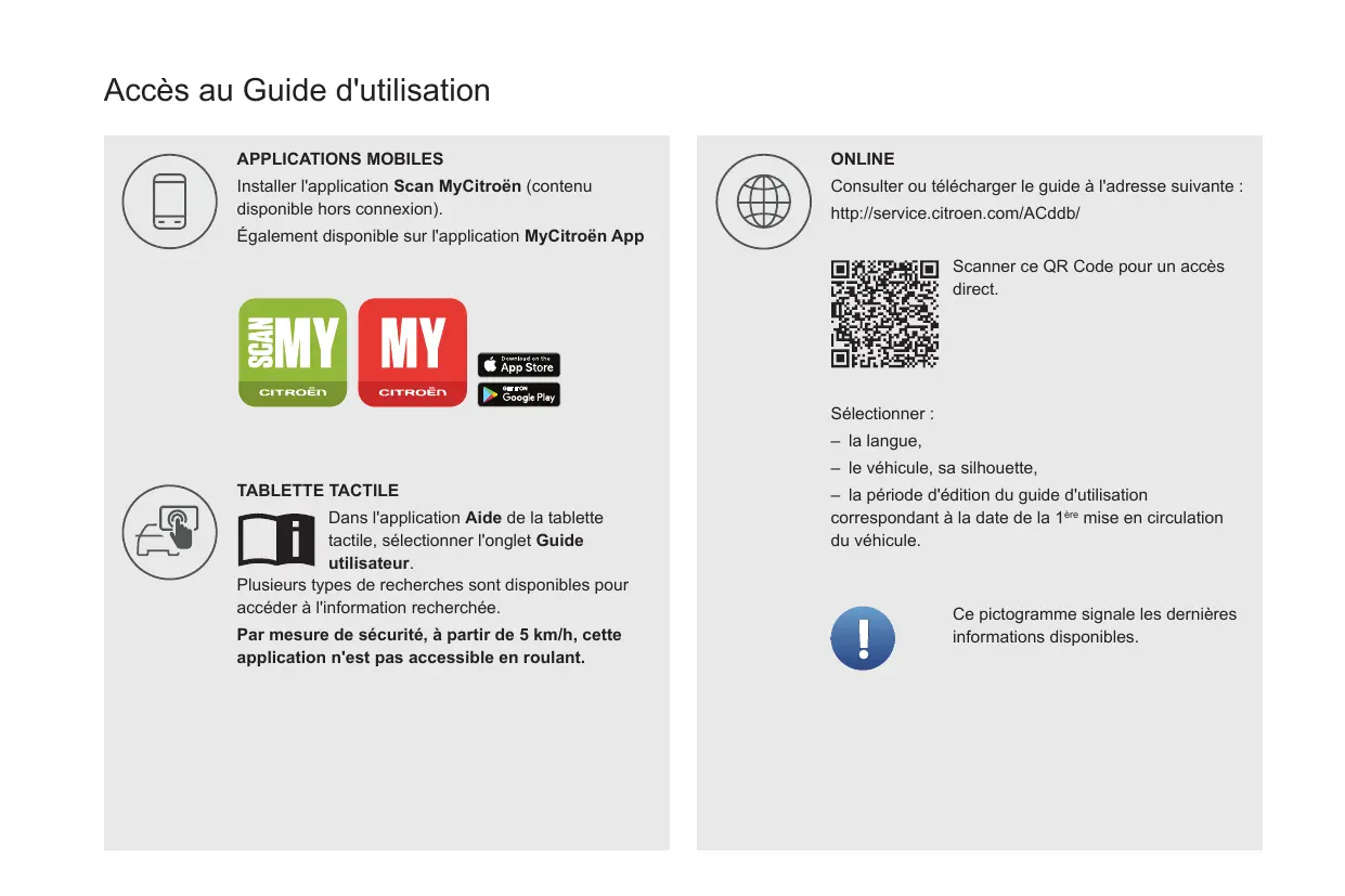 GUIDE D'UTILISATION Accès au Guide d'utilisation APPLICATIONS MOBILES ONLINE Installer l'application Scan MyCitroën (contenu disponible hors connexion). Consulter ou télécharger le guide à l'adresse suivante : Également disponible sur l'application MyCitroën App http://service.citroen.com/ACddb/ Scanner ce QR Code pour un accès direct. Sélectionner : – la langue, TABLETTE TACTILE Dans l'application Aide de la tablette tactile, sélectionner l'onglet Guide utilisateur. Plusieurs types de recherches sont disponibles pour accéder à l'information recherchée. Par mesure de sécurité, à partir de 5 km/h, cette application n'est pas accessible en roulant. – le véhicule, sa silhouette, – la période d'édition du guide d'utilisation correspondant à la date de la 1ère mise en circulation du véhicule. Ce pictogramme signale les dernières informations disponibles. Bienvenue Légende Avertissement pour la sécurité Nous vous remercions d'avoir choisi une Citroën C5 X. Ce document présente les informations et recommandations indispensables à la découverte de votre véhicule, en toute sécurité. Il est fortement recommandé d'en prendre connaissance ainsi que du carnet d’entretien. Votre véhicule reprend une partie des équipements décrits dans ce document, en fonction du niveau de finition, de la version et des caractéristiques propres au pays de commercialisation. Les descriptions et figures sont fournies sans engagement. Automobiles CITROËN se réserve le droit de modifier les caractéristiques techniques, équipements et accessoires sans être tenue de mettre à jour le présent guide. En cas de cession de votre véhicule, penser à remettre ce Guide d'utilisation au nouveau propriétaire. Pour toute intervention sur votre véhicule, s'adresser au réseau du Constructeur, ci-après dénommé le "Réseau", ou à un atelier qualifié. Information complémentaire Contribution à la protection de la nature Véhicule avec poste de conduite à gauche Véhicule avec poste de conduite à droite Localisation par une zone noire de l'équipement / du bouton décrit. Sommaire Vue d’ensemble ■ Eco-conduite ■ Instruments de bord Informations au conducteur Combiné numérique E-HUD Témoins lumineux Indicateurs Test manuel Totalisateur kilométrique Ordinateur de bord Écran tactile Fonctionnalités disponibles à distance (Hybride rechargeable) Ouvertures Clé électronique avec fonction télécommande et clé intégrée ADML Proximity Verrouillage centralisé Procédures de secours Portes Coffre Hayon motorisé Alarme Lève-vitres électriques Toit ouvrant Position de conduite