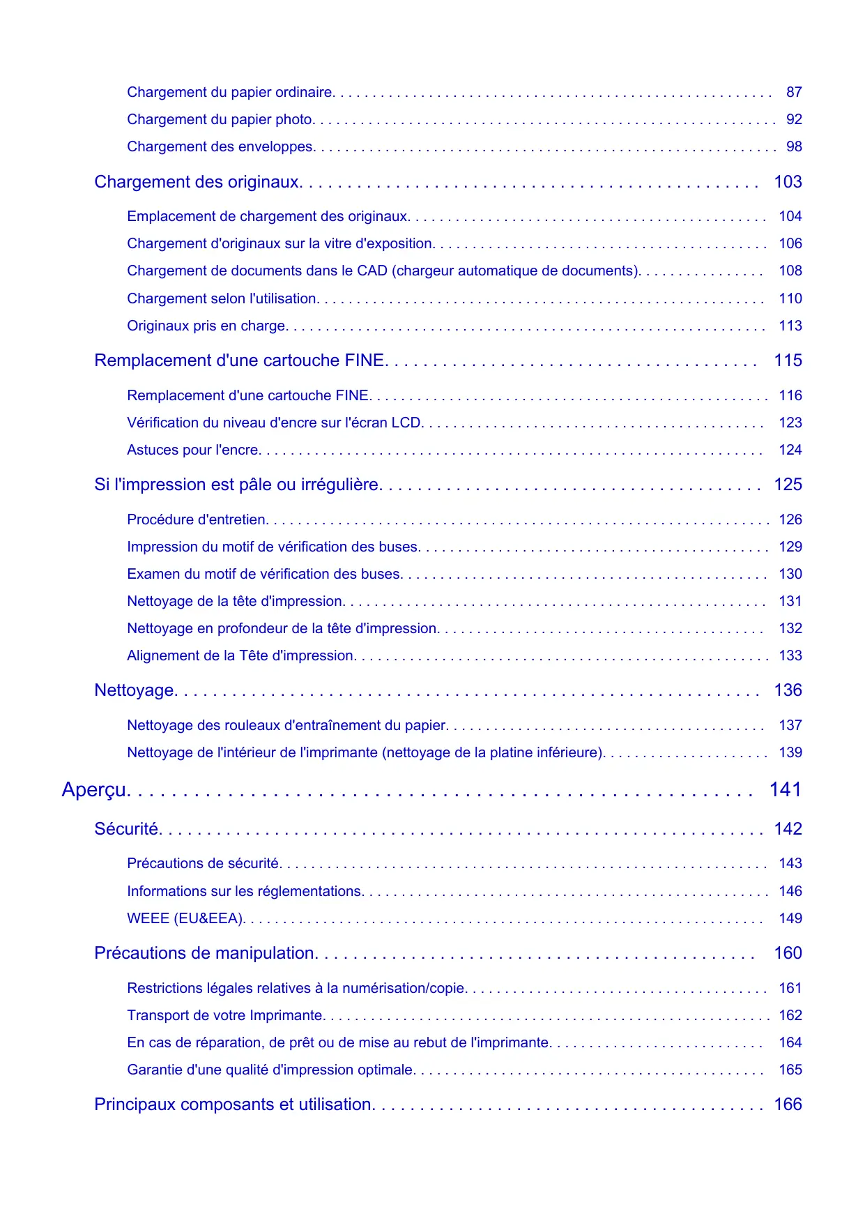 Chargement selon l'utilisation. . . . . . . . . . . . . . . . . . . . . . . . . . . . . . . . . . . . . . . . . . . . . . . . . . . . . . . . 110 Originaux pris en charge. . . . . . . . . . . . . . . . . . . . . . . . . . . . . . . . . . . . . . . . . . . . . . . . . . . . . . . . . . . . 113 Remplacement d'une cartouche FINE. . . . . . . . . . . . . . . . . . . . . . . . . . . . . . . . . . . . . . . 115 Remplacement d'une cartouche FINE. . . . . . . . . . . . . . . . . . . . . . . . . . . . . . . . . . . . . . . . . . . . . . . . . . 116 Vérification du niveau d'encre sur l'écran LCD. . . . . . . . . . . . . . . . . . . . . . . . . . . . . . . . . . . . . . . . . . . 123 Astuces pour l'encre. . . . . . . . . . . . . . . . . . . . . . . . . . . . . . . . . . . . . . . . . . . . . . . . . . . . . . . . . . . . . . .