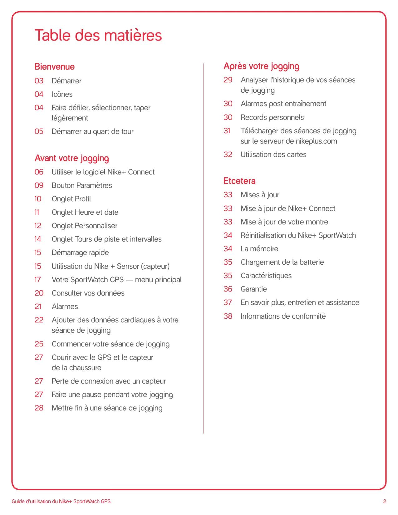Votre produit est garanti par Nike* et TomTom* contre les défauts de main-d’œuvre ou de matériel dans des conditions d’utilisation normales, pour une période d’un an à compter de la date d’achat. Cette garantie limitée ne comprend pas les dommages résultant d’une mauvaise manipulation, d’accidents, de modifications, de réparations non autorisées, de l’usure normale ou d’autres causes que les défauts de matériel et de main-d’œuvre. Si votre produit est défectueux, retournez-le au magasin où vous l’avez acheté, accompagné de son ticket de caisse. En cas de défaut couvert par la garantie, nous réparerons ou remplacerons gratuitement le produit ou le rembourserons, à notre discrétion. Le produit est fourni « EN L’ÉTAT ET SANS GARANTIE AUCUNE ». Nike et TomTom dégagent par la présente leur responsabilité pour toutes autres garanties, conditions ainsi que pour la fourniture ou la non-fourniture d’assistance ou d’autres services, informations, logiciels et contenus apparentés par le biais du produit ou découlant de l’utilisation du produit. La garantie limitée remplace toutes autres garanties expresses et implicites quelles qu’elles soient, qui sont par la présente exclues. Nike et TomTom ne seront en aucune façon responsables de dommages directs, indirects ou accessoires résultant de l’utilisation du produit, et toute indemnisation est limitée au prix d’achat. Aucune autre personne ou société n’est autorisée à modifier cette garantie limitée et votre revendeur est seul responsable de toute autre garantie. Certains États ne permettant pas la limitation de la durée d’une garantie implicite ou l’exclusion de dommages indirects ou accessoires, il est possible que les limitations ci-dessus ne s’appliquent pas à vous. Cette garantie vous donne des droits légaux spécifiques et il est possible que vous ayez d’autres droits, qui varient d’un État à l’autre. Ce qui précède est sous réserve d’autres droits légaux pouvant s’appliquer en vertu de la législation nationale en vigueur. La garantie ne couvre que les produits achetés chez un revendeur Nike ou TomTom agréé. *Dans les pays européens, Nike signifie Nike European Operations Netherlands B.V. domiciliée à Colosseum 1, 1213 NL Hilversum, Pays-Bas et TomTom signifie TomTom International BV, domiciliée à Oosterdoksstraat 114, 1011 DK, Amsterdam, Pays-Bas. Guide d’utilisation du Nike+ SportWatch GPS