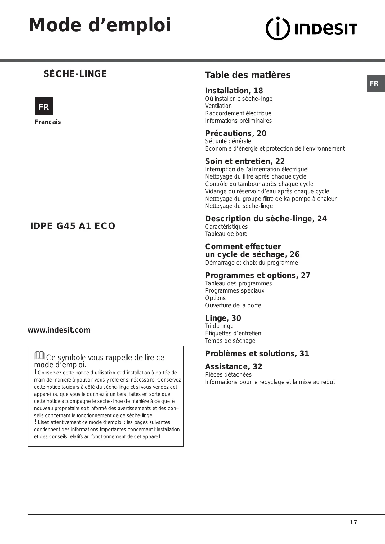 Retrouvez gratuitement la notice de l'appareil IDPE G45X A1 ECO INDESIT au format PDF.