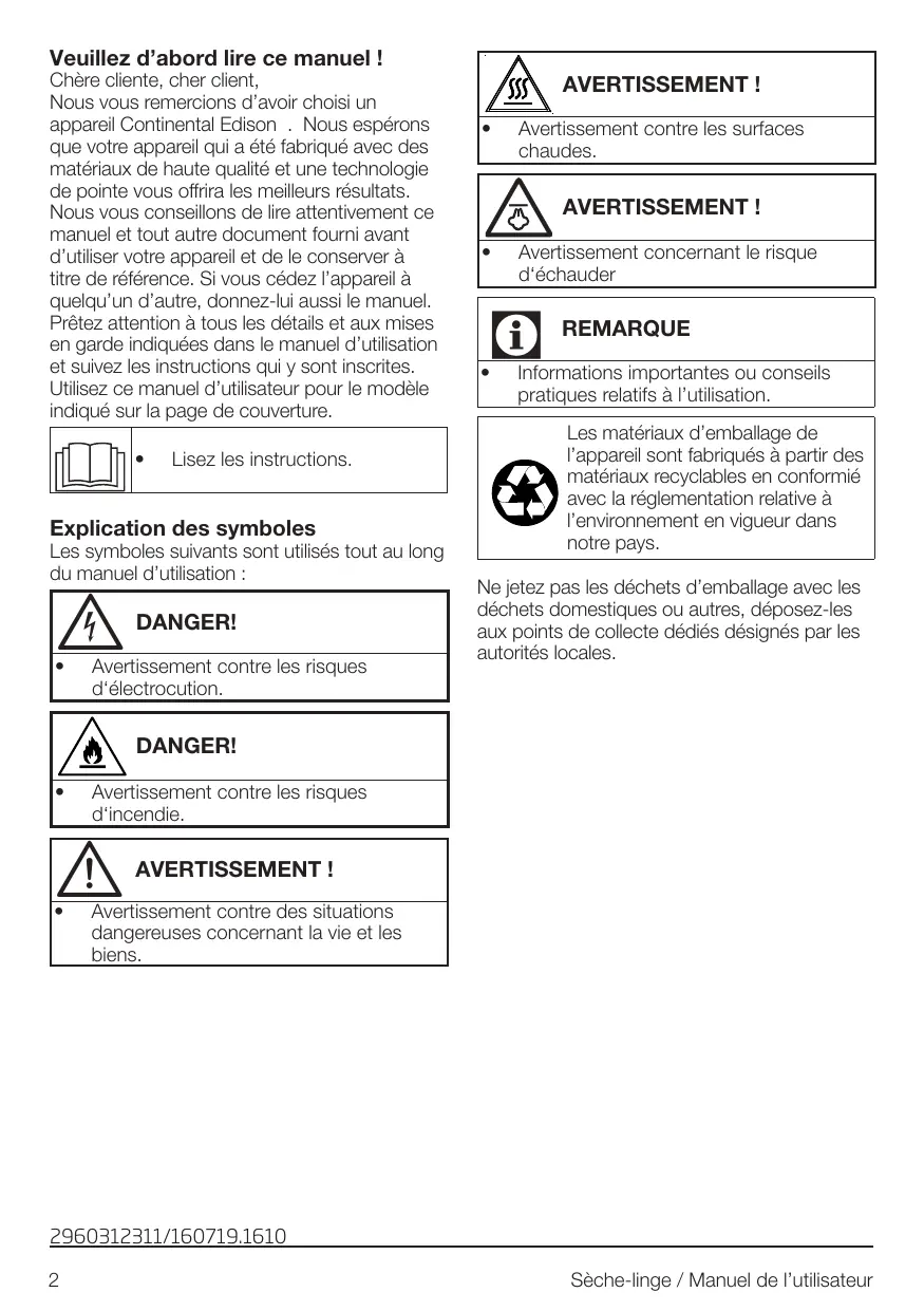 AVERTISSEMENT ! Avertissement contre des situations dangereuses concernant la vie et les biens. 2960312311/160719.1610