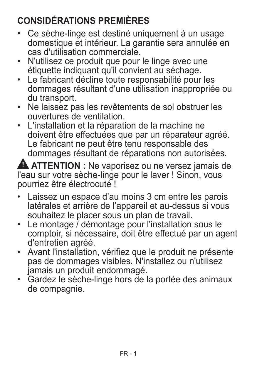 - Gardez le sèche-linge hors de la portée des animaux de compagnie. FR - 1