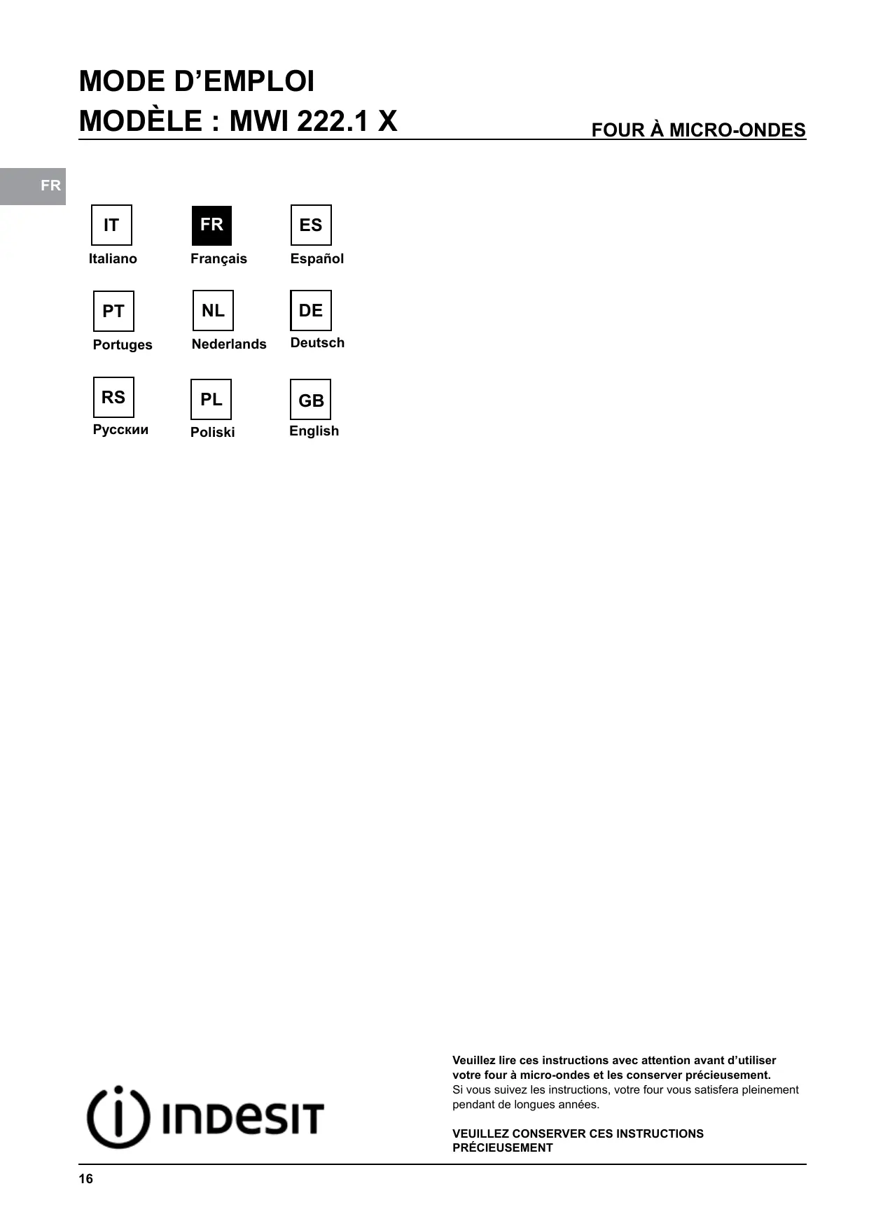 MWI 222.1 - Four à micro-ondes INDESIT - Notice d'utilisation et mode d'emploi gratuit