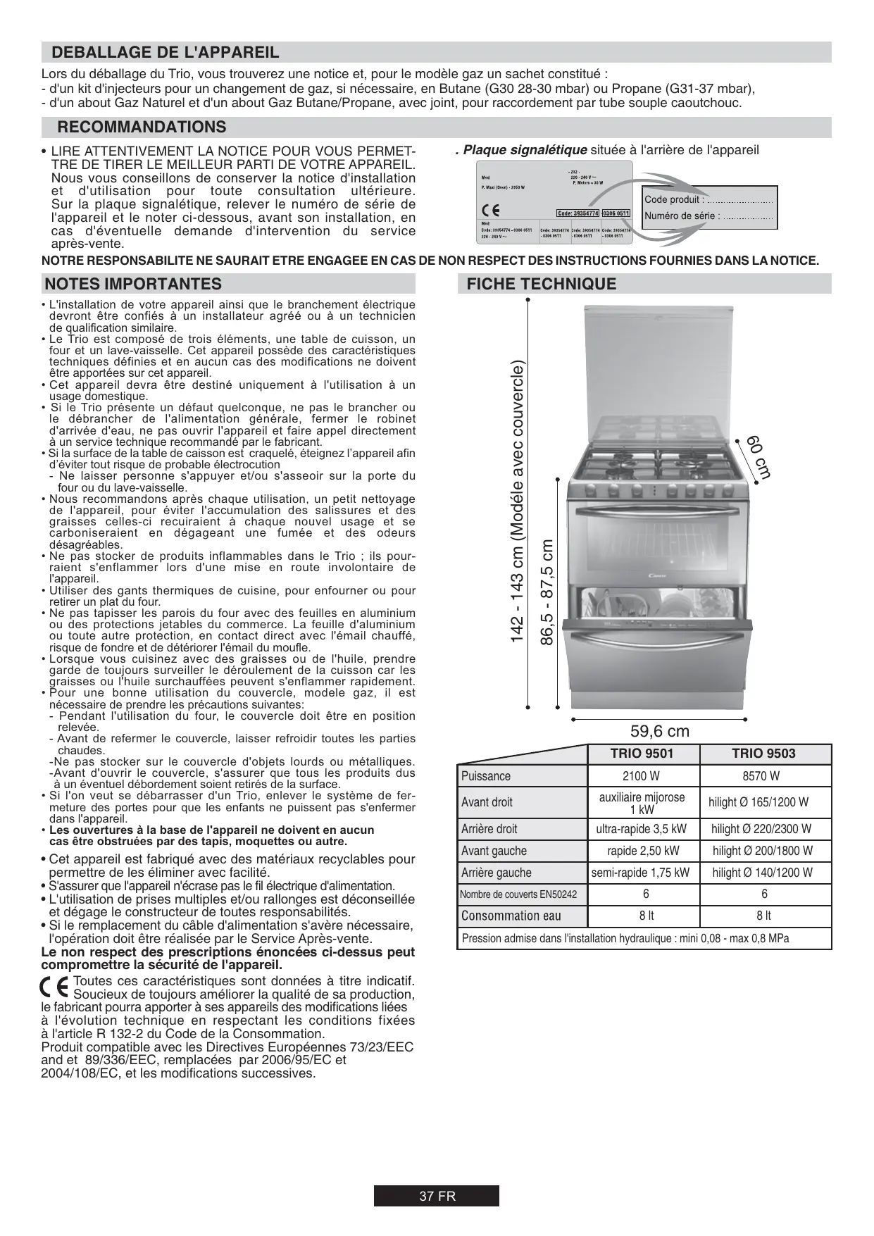 Lors du déballage du Trio, vous trouverez une notice et, pour le modèle gaz un sachet constitué : - d'un kit d'injecteurs pour un changement de gaz, si nécessaire, en Butane (G30 28-30 mbar) ou Propane (G31-37 mbar), - d'un about Gaz Naturel et d'un about Gaz Butane/Propane, avec joint, pour raccordement par tube souple caoutchouc. RECOMMANDATIONS ;^& A&#¢&&#T LA#_]&_>^¢_>&^&TTRE DE ^&^;&&;;&>^PAR!&¢_^& APP^&;$ Nous vous conseillons de conserver la notice d'installation et d'utilisation pour toute consultation ultérieure. Sur la plaque signalétique, relever le numéro de série de l'appareil et le noter ci-dessous, avant son installation, en cas d'éventuelle demande d'intervention du service après-vente. . Plaque signalétique située à l'arrière de l'appareil NOTRE RESPONSABILITE NE SAURAIT ETRE ENGAGEE EN CAS DE NON RESPECT DES INSTRUCTIONS FOURNIES DANS LA NOTICE. NOTES IMPORTANTES FICHE TECHNIQUE 86,5 - 87,5 cm