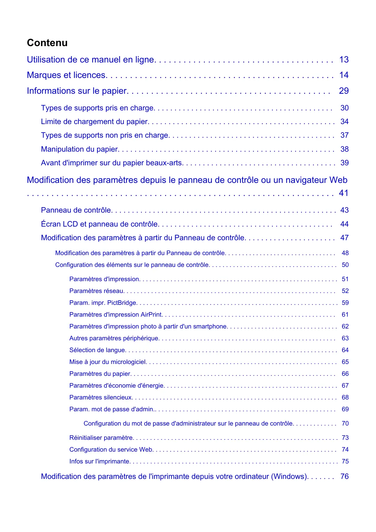 Modification des paramètres à partir du Panneau de contrôle Modification des paramètres à partir du Panneau de contrôle Configuration des éléments sur le panneau de contrôle Param. impr. Paramètres réseau Param. impr. PictBridge Paramètres d'impression AirPrint Paramètres du papier Paramètres d'économie d'énergie Paramètres silencieux Param. mot de passe d'admin. Configuration du mot de passe d'administrateur sur le panneau de contrôle