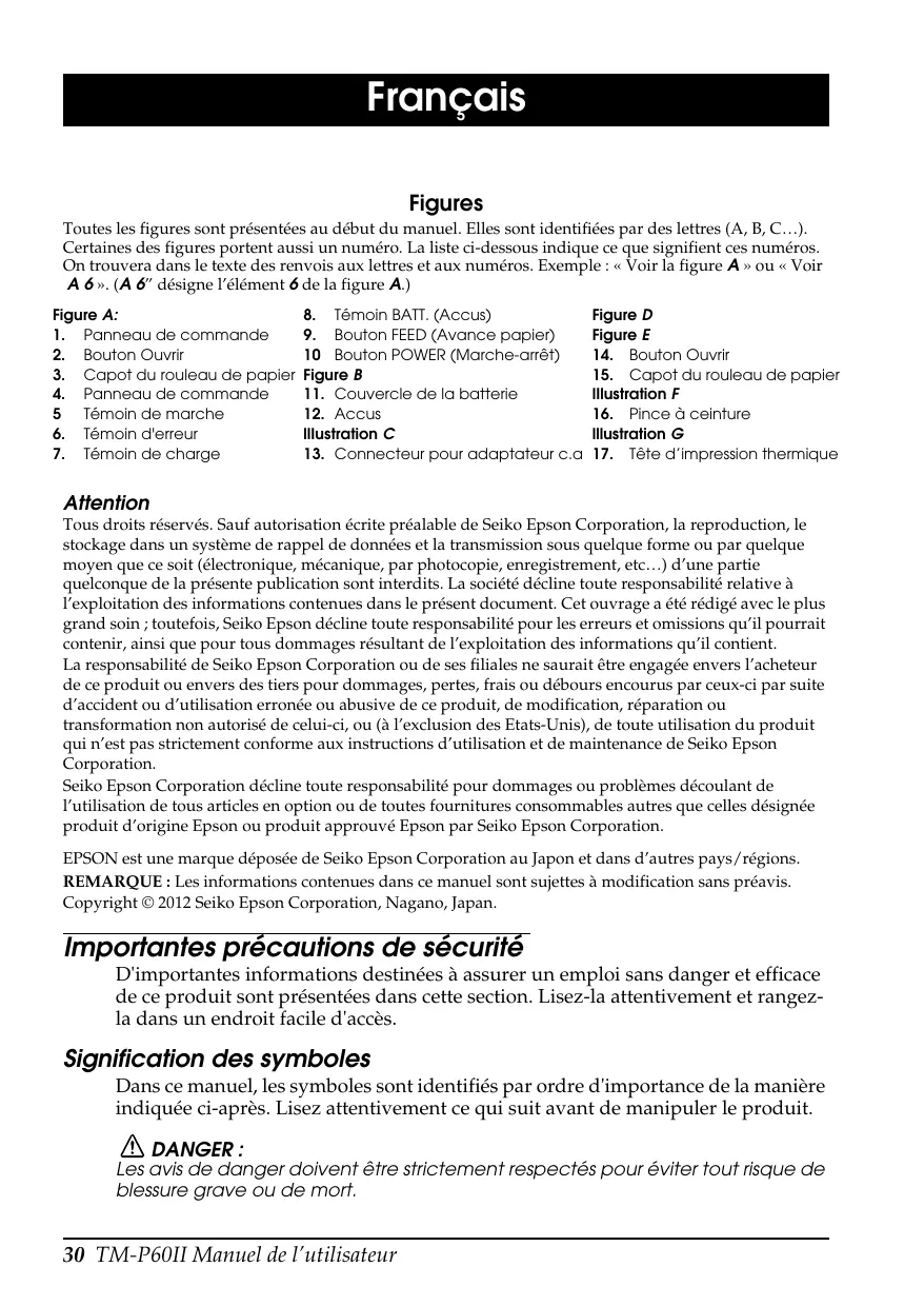 Tous droits réservés. Sauf autorisation écrite préalable de Seiko Epson Corporation, la reproduction, le stockage dans un système de rappel de données et la transmission sous quelque forme ou par quelque moyen que ce soit (électronique, mécanique, par photocopie, enregistrement, etc…) d’une partie quelconque de la présente publication sont interdits. La société décline toute responsabilité relative à l’exploitation des informations contenues dans le présent document. Cet ouvrage a été rédigé avec le plus grand soin ; toutefois, Seiko Epson décline toute responsabilité pour les erreurs et omissions qu’il pourrait contenir, ainsi que pour tous dommages résultant de l’exploitation des informations qu’il contient. La responsabilité de Seiko Epson Corporation ou de ses filiales ne saurait être engagée envers l’acheteur de ce produit ou envers des tiers pour dommages, pertes, frais ou débours encourus par ceux-ci par suite d’accident ou d’utilisation erronée ou abusive de ce produit, de modification, réparation ou transformation non autorisé de celui-ci, ou (à l’exclusion des Etats-Unis), de toute utilisation du produit qui n’est pas strictement conforme aux instructions d’utilisation et de maintenance de Seiko Epson Corporation. Seiko Epson Corporation décline toute responsabilité pour dommages ou problèmes découlant de l’utilisation de tous articles en option ou de toutes fournitures consommables autres que celles désignée produit d’origine Epson ou produit approuvé Epson par Seiko Epson Corporation. EPSON est une marque déposée de Seiko Epson Corporation au Japon et dans d’autres pays/régions. REMARQUE : Les informations contenues dans ce manuel sont sujettes à modification sans préavis. Copyright © 2012 Seiko Epson Corporation, Nagano, Japan.