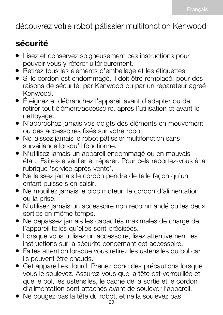 Retirez tous les éléments d’emballage et les étiquettes. Si le cordon est endommagé, il doit être remplacé, pour des raisons de sécurité, par Kenwood ou par un réparateur agréé Kenwood. Éteignez et débranchez l’appareil avant d’adapter ou de retirer tout élément/accessoire, après l’utilisation et avant le nettoyage. N’approchez jamais vos doigts des éléments en mouvement ou des accessoires fixés sur votre robot. Ne laissez jamais le robot pâtissier multifonction sans surveillance lorsqu’il fonctionne. N’utilisez jamais un appareil endommagé ou en mauvais état. Faites-le vérifier et réparer. Pour cela reportez-vous à la rubrique ‘service après-vente’. Ne laissez jamais le cordon pendre de telle façon qu’un enfant puisse s’en saisir. Ne mouillez jamais le bloc moteur, le cordon d’alimentation ou la prise. N’utilisez jamais un accessoire non recommandé ou les deux sorties en même temps. Ne dépassez jamais les capacités maximales de charge de l’appareil telles qu’elles sont précisées. Lorsque vous utilisez un accessoire, lisez attentivement les instructions sur la sécurité concernant cet accessoire. Faites attention lorsque vous retirez les ustensiles du bol car ils peuvent être chauds. Cet appareil est lourd. Prenez donc des précautions lorsque vous le soulevez. Assurez-vous que la tête est verrouillée et que le bol, les ustensiles, le cache de la sortie et le cordon d’alimentation sont attachés avant de soulever l’appareil. Ne bougez pas la tête du robot, et ne la soulevez pas 23