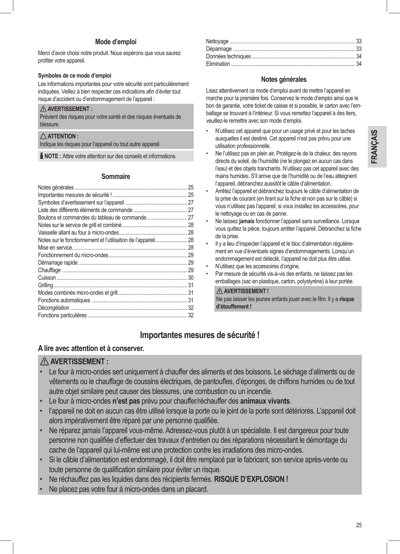 Notes générales 25 Importantes mesures de sécurité ! 25 Symboles d’avertissement sur l’appareil 27 Liste des différents éléments de commande 27 Boutons et commandes du tableau de commande 27 Notes sur le service de grill et combiné 28 Vaisselle allant au four à micro-ondes 28 Notes sur le fonctionnement et l’utilisation de l’appareil 28 Mise en service 28 Fonctionnement du micro-ondes 29 Démarrage rapide 29 Chauffage 29 Cuisson 30 Grilling 31 Modes combinés micro-ondes et grill 31 Fonctions automatiques 31 Décongélation 32 Fonctions particulières 32