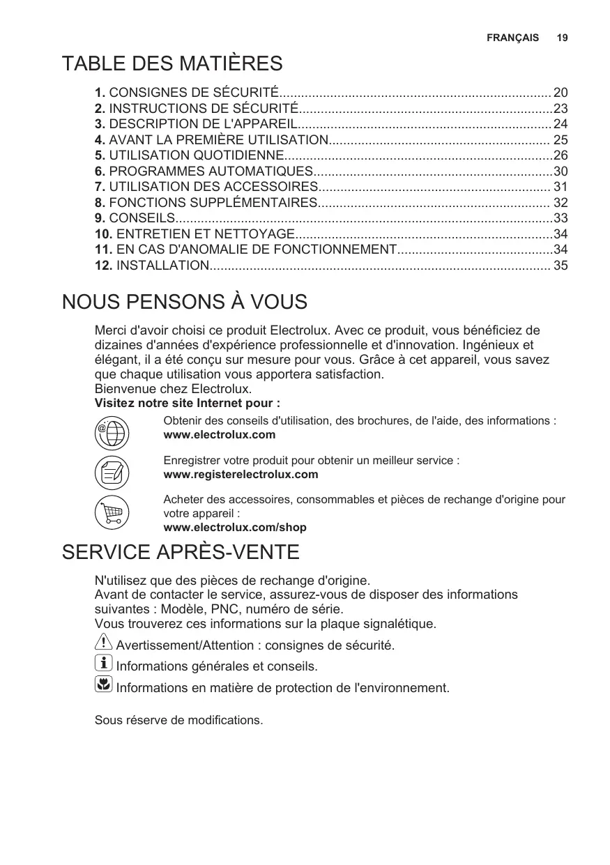 NOUS PENSONS À VOUS Merci d'avoir choisi ce produit Electrolux. Avec ce produit, vous bénéficiez de dizaines d'années d'expérience professionnelle et d'innovation. Ingénieux et