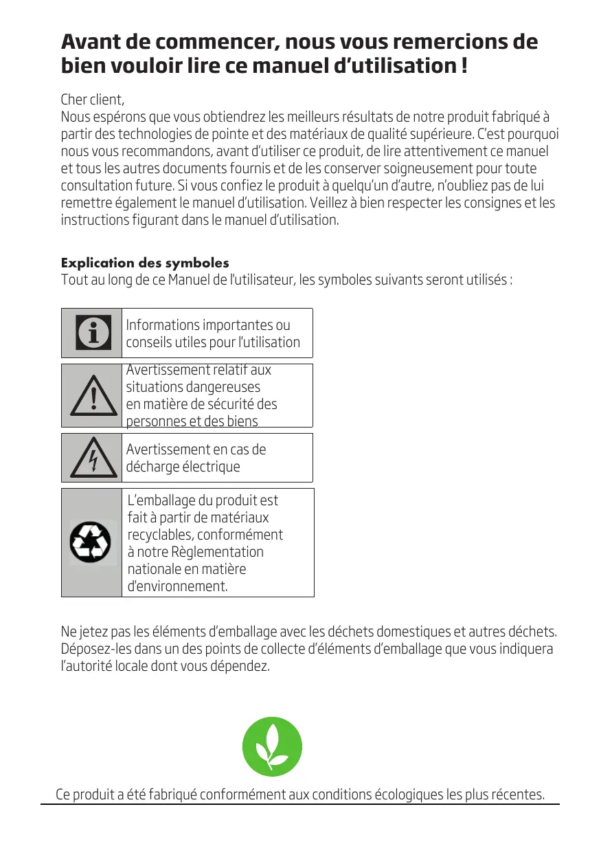 Informations importantes ou conseils utiles pour l'utilisation Avertissement relatif aux situations dangereuses en matière de sécurité des personnes et des biens Avertissement en cas de décharge électrique L’emballage du produit est fait à partir de matériaux recyclables, conformément à notre Règlementation nationale en matière d'environnement. Ne jetez pas les éléments d’emballage avec les déchets domestiques et autres déchets. Déposez-les dans un des points de collecte d’éléments d’emballage que vous indiquera l’autorité locale dont vous dépendez. Ce produit a été fabriqué conformément aux conditions écologiques les plus récentes.