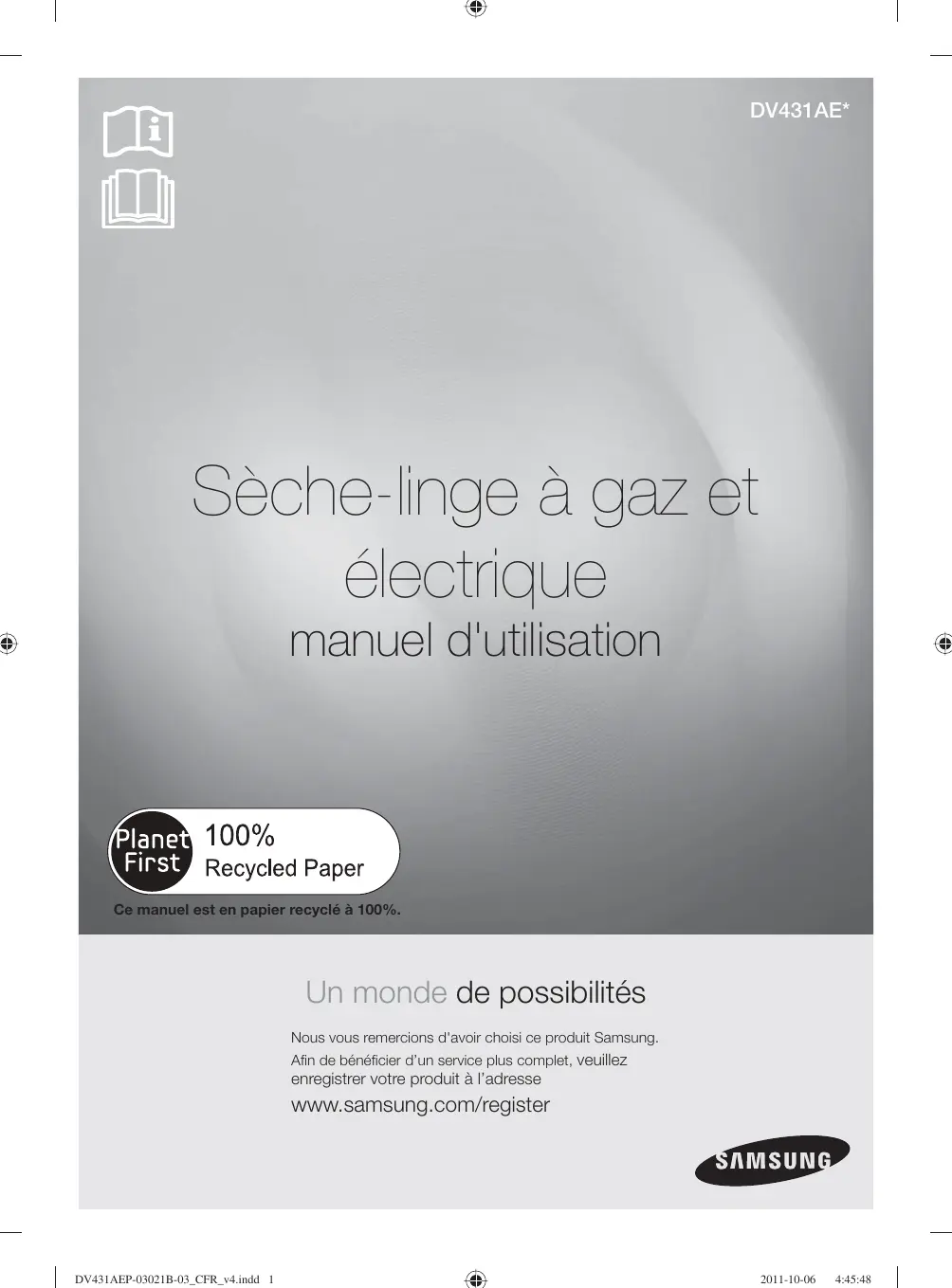 CANADA 1-800-SAMSUNG(726-7864) www.samsung.com Code No. DC68-03021B-03_EN DV431AEP-03021B-03_EN_v4.indd Sec11:40 2011-10-06 4:45:33 DV431AE* Sèche-linge à gaz et électrique manuel d'utilisation Ce manuel est en papier recyclé à 100%. Un monde de possibilités Nous vous remercions d'avoir choisi ce produit Samsung. Afin de bénéficier d’un service plus complet, veuillez enregistrer votre produit à l’adresse www.samsung.com/register DV431AEP-03021B-03_CFR_v4.indd 1 2011-10-06 4:45:48 caractéristiques