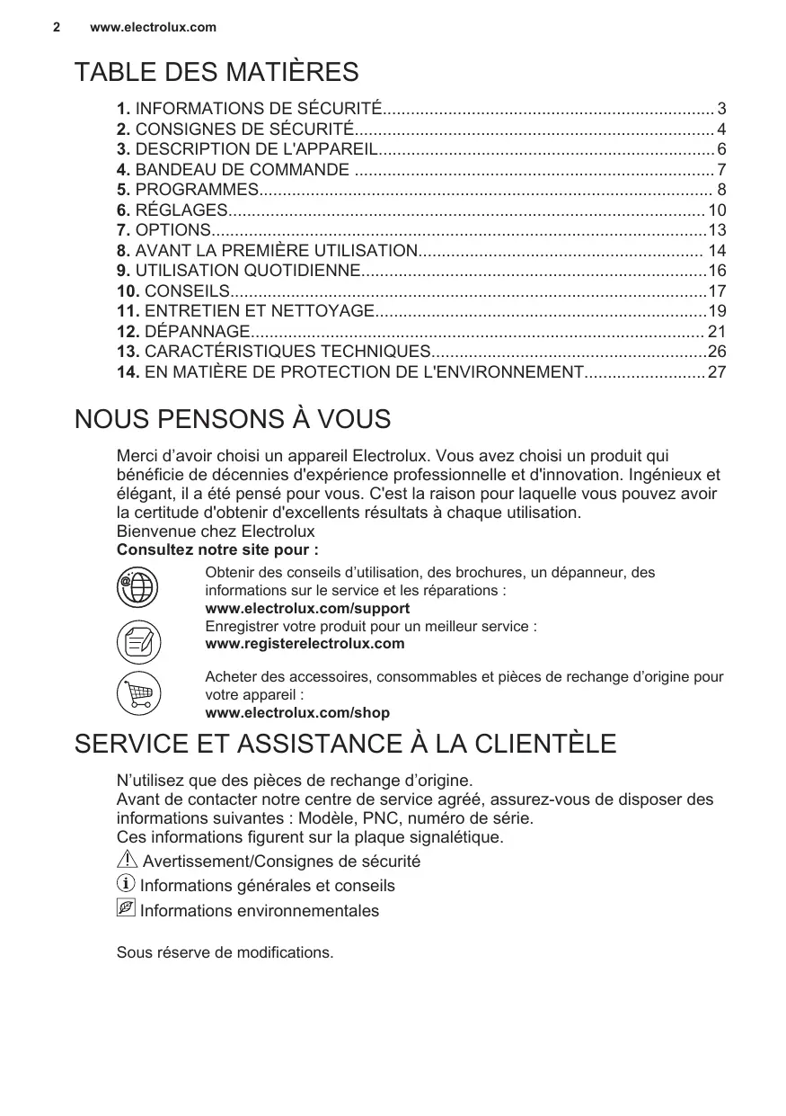 Merci d’avoir choisi un appareil Electrolux. Vous avez choisi un produit qui bénéficie de décennies d'expérience professionnelle et d'innovation. Ingénieux et élégant, il a été pensé pour vous. C'est la raison pour laquelle vous pouvez avoir la certitude d'obtenir d'excellents résultats à chaque utilisation. Bienvenue chez Electrolux Consultez notre site pour : Obtenir des conseils d’utilisation, des brochures, un dépanneur, des informations sur le service et les réparations : www.electrolux.com/support Enregistrer votre produit pour un meilleur service : www.registerelectrolux.com Acheter des accessoires, consommables et pièces de rechange d’origine pour votre appareil : www.electrolux.com/shop