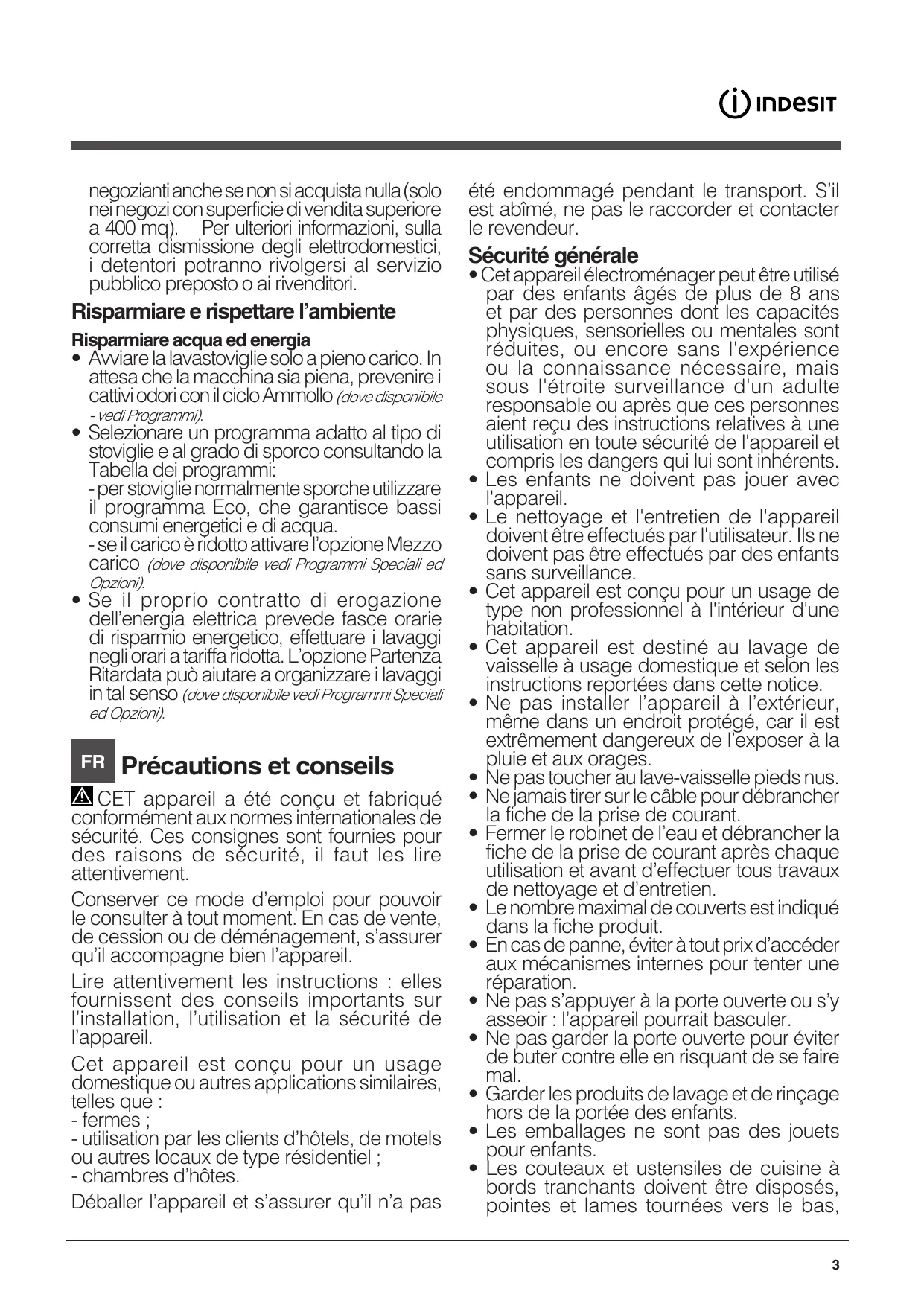 « Sixty* et Rapide 40' » il est conseillé de respecter le nombre de couverts indiqué. Pour consommer moins, utiliser le lave-vaisselle pleine charge. Note pour les laboratoires d’essai : pour toutes informations sur les conditions d’essai comparatif EN, s’adresser à : ASSISTENZA_EN_LVS@indesitcompany.com