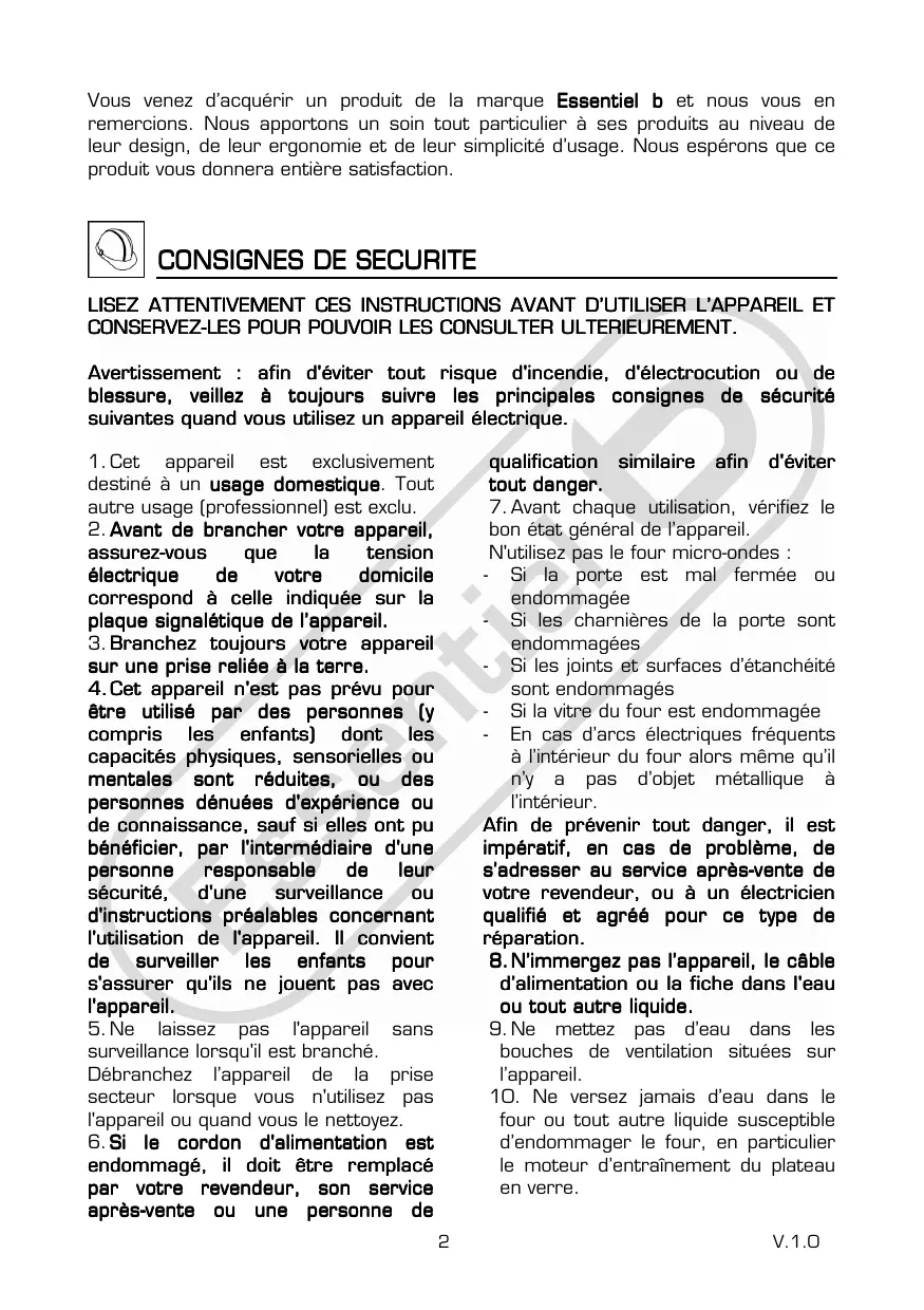 EX 303I - Four micro-ondes ESSENTIELB - Notice d'utilisation et mode d'emploi gratuit