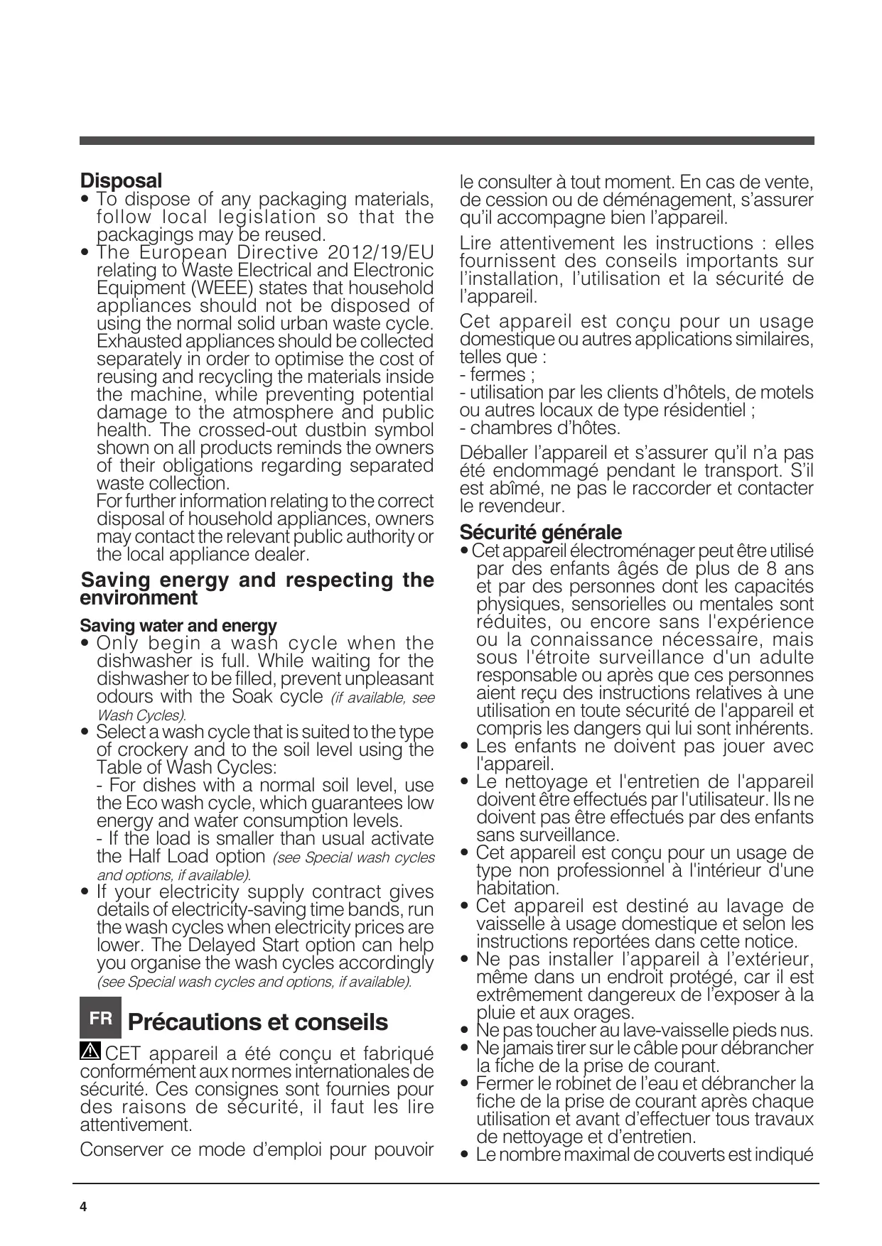 • Cet appareil électroménager peut être utilisé par des enfants âgés de plus de 8 ans et par des personnes dont les capacités physiques, sensorielles ou mentales sont réduites, ou encore sans l'expérience ou la connaissance nécessaire, mais sous l'étroite surveillance d'un adulte responsable ou après que ces personnes aient reçu des instructions relatives à une utilisation en toute sécurité de l'appareil et compris les dangers qui lui sont inhérents. • Les enfants ne doivent pas jouer avec l'appareil. • Le nettoyage et l'entretien de l'appareil doivent être effectués par l'utilisateur. Ils ne doivent pas être effectués par des enfants sans surveillance. • Cet appareil est conçu pour un usage de type non professionnel à l'intérieur d'une habitation. • Cet appareil est destiné au lavage de vaisselle à usage domestique et selon les instructions reportées dans cette notice. • Ne pas installer l’appareil à l’extérieur, même dans un endroit protégé, car il est extrêmement dangereux de l’exposer à la pluie et aux orages. • Ne pas toucher au lave-vaisselle pieds nus. • Ne jamais tirer sur le câble pour débrancher la fiche de la prise de courant. • Fermer le robinet de l’eau et débrancher la fiche de la prise de courant après chaque utilisation et avant d’effectuer tous travaux de nettoyage et d’entretien. • Le nombre maximal de couverts est indiqué