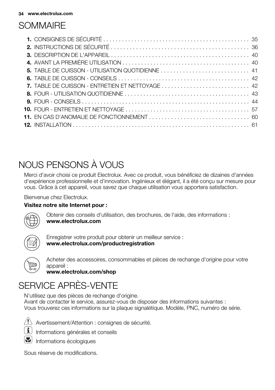 NOUS PENSONS À VOUS Merci d'avoir choisi ce produit Electrolux. Avec ce produit, vous bénéficiez de dizaines d'années d'expérience professionnelle et d'innovation. Ingénieux et élégant, il a été conçu sur mesure pour vous. Grâce à cet appareil, vous savez que chaque utilisation vous apportera satisfaction. Bienvenue chez Electrolux. Visitez notre site Internet pour : Obtenir des conseils d'utilisation, des brochures, de l'aide, des informations : www.electrolux.com Enregistrer votre produit pour obtenir un meilleur service : www.electrolux.com/productregistration Acheter des accessoires, consommables et pièces de rechange d'origine pour votre appareil : www.electrolux.com/shop