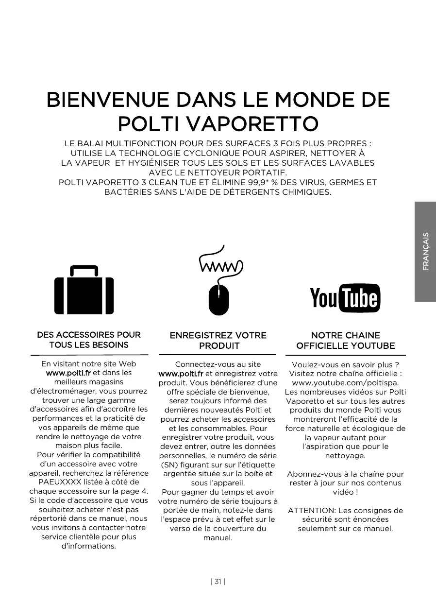 En visitant notre site Web www.polti.fr et dans les meilleurs magasins d’électroménager, vous pourrez trouver une large gamme d'accessoires afin d'accroître les performances et la praticité de vos appareils de même que rendre le nettoyage de votre maison plus facile. Pour vérifier la compatibilité d’un accessoire avec votre appareil, recherchez la référence PAEUXXXX listée à côté de chaque accessoire sur la page 4. Si le code d'accessoire que vous souhaitez acheter n’est pas répertorié dans ce manuel, nous vous invitons à contacter notre service clientèle pour plus d'informations. Connectez-vous au site Voulez-vous en savoir plus ? www.polti.fr et enregistrez votre Visitez notre chaîne officielle : produit. Vous bénéficierez d’une www.youtube.com/poltispa. offre spéciale de bienvenue, Les nombreuses vidéos sur Polti serez toujours informé des Vaporetto et sur tous les autres dernières nouveautés Polti et produits du monde Polti vous pourrez acheter les accessoires montreront l’efficacité de la et les consommables. Pour force naturelle et écologique de enregistrer votre produit, vous la vapeur autant pour devez entrer, outre les données l’aspiration que pour le personnelles, le numéro de série nettoyage. (SN) figurant sur sur l’étiquette argentée située sur la boîte et Abonnez-vous à la chaîne pour sous l’appareil. rester à jour sur nos contenus Pour gagner du temps et avoir vidéo ! votre numéro de série toujours à portée de main, notez-le dans ATTENTION: Les consignes de l’espace prévu à cet effet sur le sécurité sont énoncées verso de la couverture du seulement sur ce manuel. manuel. | 31 | Polti S.p.A. décline toute responsabilité en cas d’accidents causés par une utilisation non conforme de cet appareil. Le présent manuel décrit l’utilisation conforme du produit. Toute utilisation non conforme aux présentes recommandations annulera la garantie. SYMBOLES DE SÉCURITÉ : ATTENTION : Température élevée. Danger de brûlure ! Si cela est indiqué sur le produit, ne pas toucher les parties qui sont chaudes. ATTENTION : Vapeur. Danger de brûlure ! Cet appareil atteint des températures élevées. Une utilisation incorrecte de l’appareil peut provoquer des brûlures.