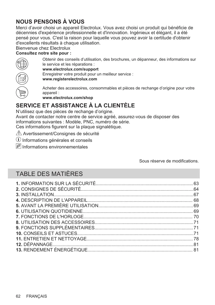 Merci d’avoir choisi un appareil Electrolux. Vous avez choisi un produit qui bénéficie de décennies d'expérience professionnelle et d'innovation. Ingénieux et élégant, il a été pensé pour vous. C'est la raison pour laquelle vous pouvez avoir la certitude d'obtenir d'excellents résultats à chaque utilisation.