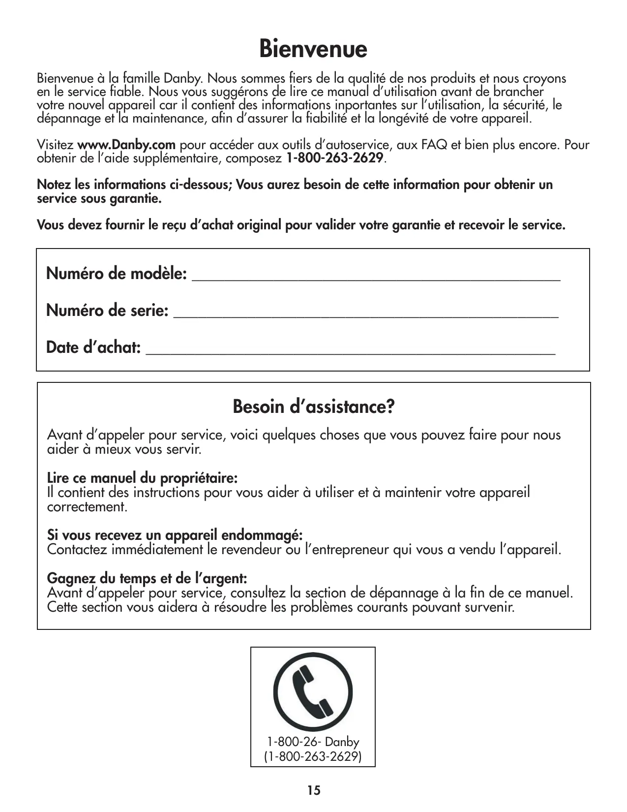 Bienvenue Bienvenue à la famille Danby. Nous sommes fiers de la qualité de nos produits et nous croyons en le service fiable. Nous vous suggérons de lire ce manual d’utilisation avant de brancher votre nouvel appareil car il contient des informations inportantes sur l’utilisation, la sécurité, le dépannage et la maintenance, afin d’assurer la fiabilité et la longévité de votre appareil. Visitez www.Danby.com pour accéder aux outils d’autoservice, aux FAQ et bien plus encore. Pour obtenir de l’aide supplémentaire, composez 1-800-263-2629. Notez les informations ci-dessous; Vous aurez besoin de cette information pour obtenir un service sous garantie. Vous devez fournir le reçu d’achat original pour valider votre garantie et recevoir le service. Numéro de modèle: _____________________________________________ Numéro de serie: _______________________________________________ Date d’achat: __________________________________________________ Besoin d’assistance? Avant d’appeler pour service, voici quelques choses que vous pouvez faire pour nous aider à mieux vous servir. Lire ce manuel du propriétaire: Il contient des instructions pour vous aider à utiliser et à maintenir votre appareil correctement. Si vous recevez un appareil endommagé: Contactez immédiatement le revendeur ou l’entrepreneur qui vous a vendu l’appareil. Gagnez du temps et de l’argent: Avant d’appeler pour service, consultez la section de dépannage à la fin de ce manuel. Cette section vous aidera à résoudre les problèmes courants pouvant survenir. 1-800-26- Danby (1-800-263-2629)