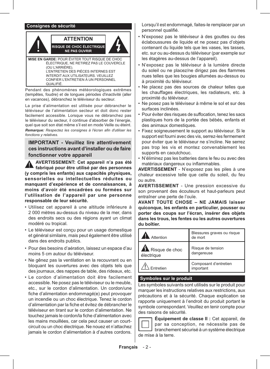 • N’éliminez pas les batteries dans le feu ou avec des matériaux dangereux ou inflammables. AVERTISSEMENT - N’exposez pas les piles à une chaleur excessive telle que celle du soleil, du feu ou autre. AVERTISSEMENT - Une pression excessive du son provenant des écouteurs et haut-parleurs peut entraîner une perte de l’ouïe. AVANT TOUTE CHOSE – NE JAMAIS laisser quiconque, les enfants en particulier, pousser ou porter des coups sur l’écran, insérer des objets dans les trous, les fentes ou les autres ouvertures du boîtier. Attention Risque de choc électrique Entretien Blessures graves ou risque de mort Risque de tension dangereuse Composant d’entretien important Symboles sur le produit Les symboles suivants sont utilisés sur le produit pour marquer les instructions relatives aux restrictions, aux précautions et à la sécurité. Chaque explication se rapporte uniquement à l’endroit du produit portant le symbole correspondant. Veuillez en tenir compte pour des raisons de sécurité. Équipement de classe II : Cet appareil, de par sa conception, ne nécessite pas de branchement sécurisé à un système électrique de mise à la terre.