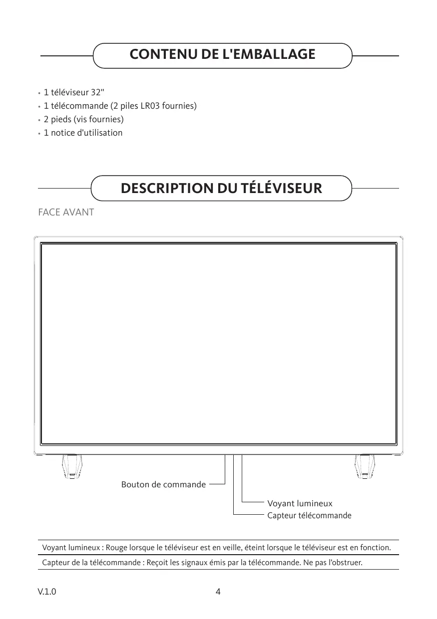 1 télécommande (2 piles LR03 fournies) 2 pieds (vis fournies) 1 notice d'utilisation