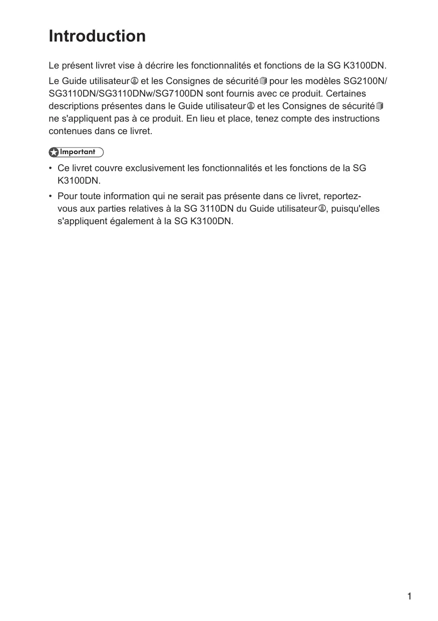 Introduction Le présent livret vise à décrire les fonctionnalités et fonctions de la SG K3100DN. Le Guide utilisateur et les Consignes de sécurité pour les modèles SG2100N/ SG3110DN/SG3110DNw/SG7100DN sont fournis avec ce produit. Certaines descriptions présentes dans le Guide utilisateur et les Consignes de sécurité ne s'appliquent pas à ce produit. En lieu et place, tenez compte des instructions contenues dans ce livret.