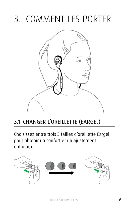 3.1 CHANGER L’OREILLETTE (EARGEL) Choisissez entre trois 3 tailles d’oreillette Eargel pour obtenir un confort et un ajustement optimaux.