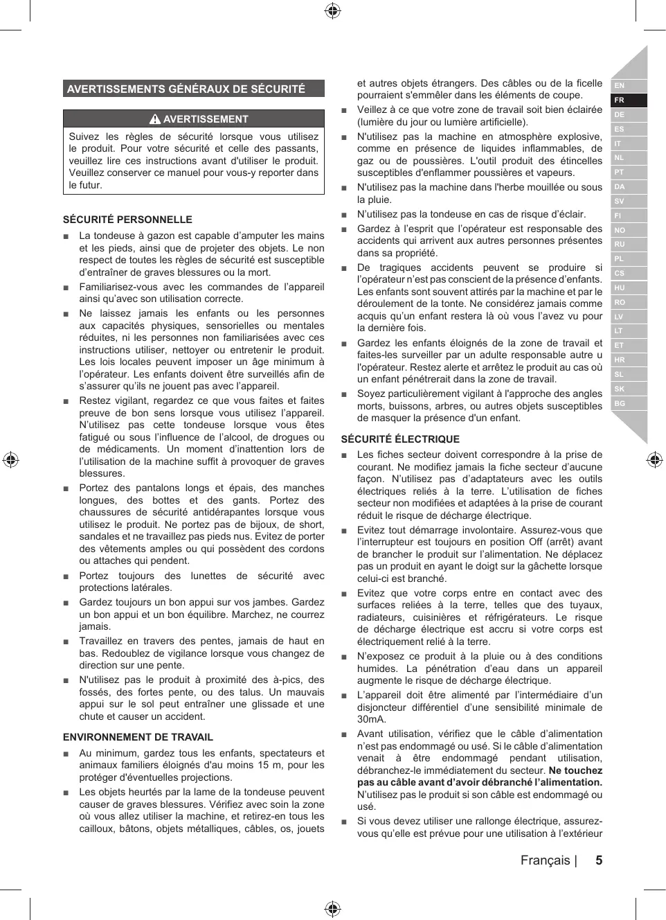 et autres objets étrangers. Des câbles ou de la ficelle pourraient s'emmêler dans les éléments de coupe. Veillez à ce que votre zone de travail soit bien éclairée (lumière du jour ou lumière artificielle). N'utilisez pas la machine en atmosphère explosive, comme en présence de liquides inflammables, de gaz ou de poussières. L'outil produit des étincelles susceptibles d'enflammer poussières et vapeurs. N'utilisez pas la machine dans l'herbe mouillée ou sous la pluie. N’utilisez pas la tondeuse en cas de risque d’éclair. Gardez à l’esprit que l’opérateur est responsable des accidents qui arrivent aux autres personnes présentes dans sa propriété. De tragiques accidents peuvent se produire si l’opérateur n’est pas conscient de la présence d’enfants. Les enfants sont souvent attirés par la machine et par le déroulement de la tonte. Ne considérez jamais comme acquis qu’un enfant restera là où vous l’avez vu pour la dernière fois. Gardez les enfants éloignés de la zone de travail et faites-les surveiller par un adulte responsable autre u l'opérateur. Restez alerte et arrêtez le produit au cas où un enfant pénétrerait dans la zone de travail. Soyez particulièrement vigilant à l'approche des angles morts, buissons, arbres, ou autres objets susceptibles de masquer la présence d'un enfant. Les fiches secteur doivent correspondre à la prise de courant. Ne modifiez jamais la fiche secteur d’aucune façon. N’utilisez pas d’adaptateurs avec les outils électriques reliés à la terre. L’utilisation de fiches secteur non modifiées et adaptées à la prise de courant réduit le risque de décharge électrique. Evitez tout démarrage involontaire. Assurez-vous que l’interrupteur est toujours en position Off (arrêt) avant de brancher le produit sur l’alimentation. Ne déplacez pas un produit en ayant le doigt sur la gâchette lorsque celui-ci est branché. Evitez que votre corps entre en contact avec des surfaces reliées à la terre, telles que des tuyaux, radiateurs, cuisinières et réfrigérateurs. Le risque de décharge électrique est accru si votre corps est électriquement relié à la terre. N’exposez ce produit à la pluie ou à des conditions humides. La pénétration d’eau dans un appareil augmente le risque de décharge électrique. L’appareil doit être alimenté par l’intermédiaire d’un disjoncteur différentiel d’une sensibilité minimale de 30mA. Avant utilisation, vérifiez que le câble d’alimentation n’est pas endommagé ou usé. Si le câble d’alimentation venait à être endommagé pendant utilisation, débranchez-le immédiatement du secteur. Ne touchez pas au câble avant d’avoir débranché l’alimentation. N’utilisez pas le produit si son câble est endommagé ou usé. Si vous devez utiliser une rallonge électrique, assurezvous qu’elle est prévue pour une utilisation à l’extérieur Français |