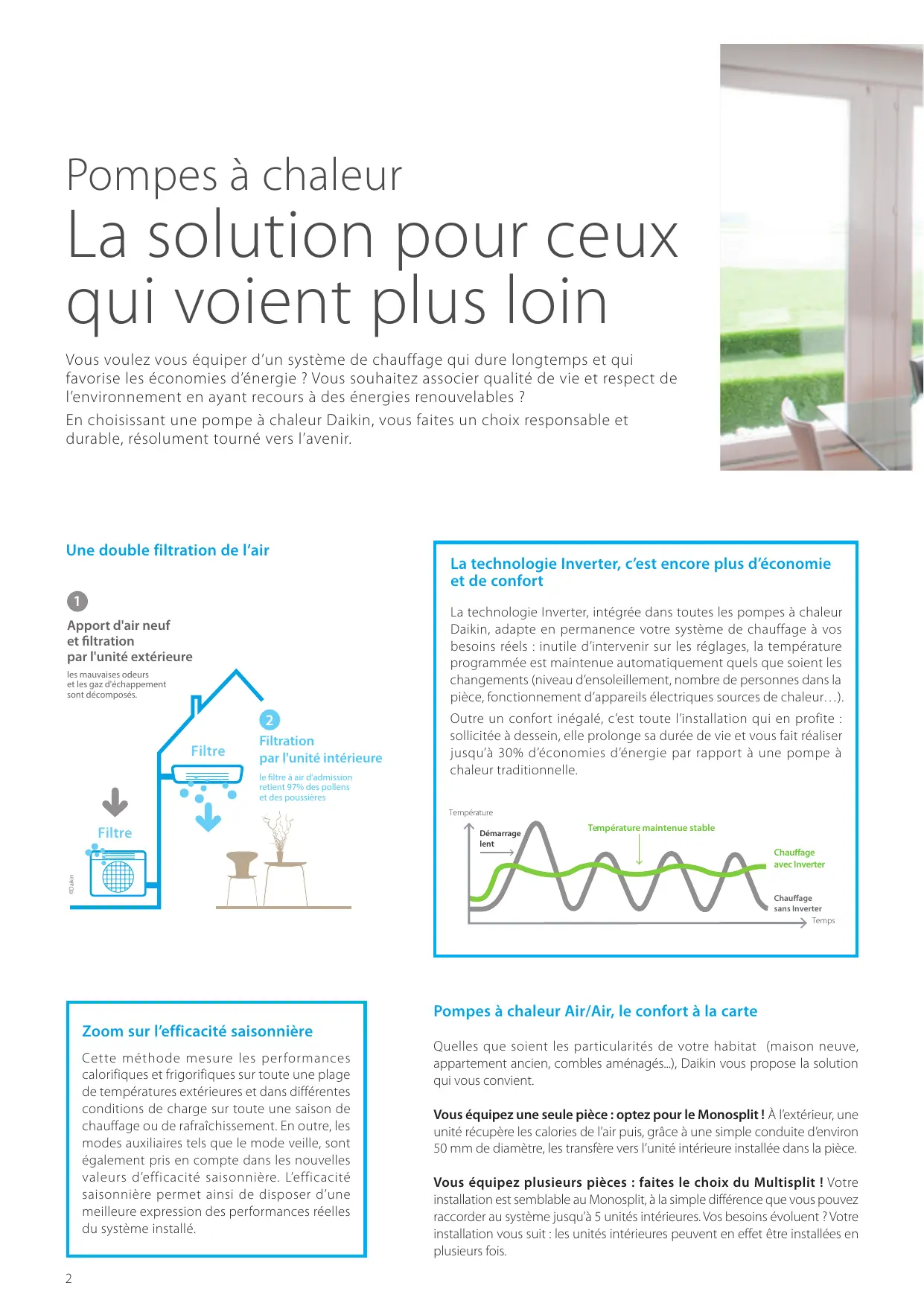 Filtre La technologie Inverter, c’est encore plus d’économie et de confort Filtration par l'unité intérieure le filtre à air d'admission retient 97% des pollens et des poussières avec Inverter Outre un confort inégalé, c’est toute l’installation qui en profite : sollicitée à dessein, elle prolonge sa durée de vie et vous fait réaliser Chauffage sans Inverter jusqu’à 30% d’économies d’énergie par rapport à une pompe à chaleur traditionnelle. Température Démarrage lent Température maintenue stable Chauffage avec Inverter ©Daikin Filtre Chauffage sans Inverter Temps Température Démarrage lent Zoom sur l’efficacité saisonnière Cette méthode mesure les per formances calorifiques et frigorifiques sur toute une plage de températures extérieures et dans différentes conditions de charge sur toute une saison de chauffage ou de rafraîchissement. En outre, les modes auxiliaires tels que le mode veille, sont également pris en compte dans les nouvelles valeurs d’efficacité saisonnière. L’efficacité saisonnière permet ainsi de disposer d’une meilleure expression des performances réelles du système installé.