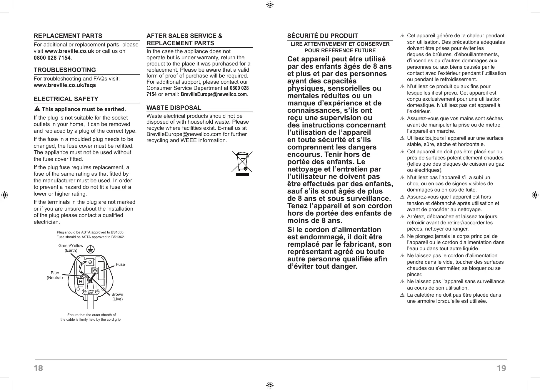WASTE DISPOSAL Waste electrical products should not be disposed of with household waste. Please recycle where facilities exist. E-mail us at BrevilleEurope@newellco.com for further recycling and WEEE information.