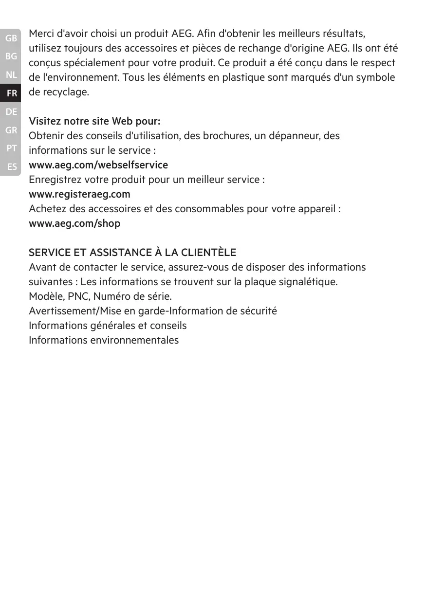 Merci d'avoir choisi un produit AEG. Afin d'obtenir les meilleurs résultats, utilisez toujours des accessoires et pièces de rechange d'origine AEG. Ils ont été conçus spécialement pour votre produit. Ce produit a été conçu dans le respect de l'environnement. Tous les éléments en plastique sont marqués d'un symbole de recyclage. Visitez notre site Web pour: Obtenir des conseils d'utilisation, des brochures, un dépanneur, des informations sur le service : www.aeg.com/webselfservice Enregistrez votre produit pour un meilleur service : www.registeraeg.com Achetez des accessoires et des consommables pour votre appareil : www.aeg.com/shop