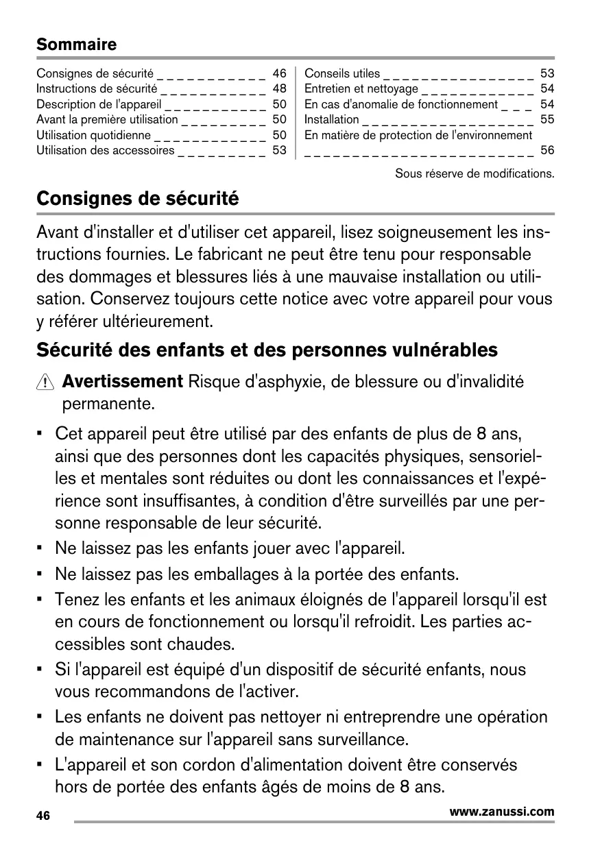 Sécurité des enfants et des personnes vulnérables Avertissement Risque d'asphyxie, de blessure ou d'invalidité permanente. • Cet appareil peut être utilisé par des enfants de plus de 8 ans, ainsi que des personnes dont les capacités physiques, sensorielles et mentales sont réduites ou dont les connaissances et l'expérience sont insuffisantes, à condition d'être surveillés par une personne responsable de leur sécurité. • Ne laissez pas les enfants jouer avec l'appareil. • Ne laissez pas les emballages à la portée des enfants. • Tenez les enfants et les animaux éloignés de l'appareil lorsqu'il est en cours de fonctionnement ou lorsqu'il refroidit. Les parties accessibles sont chaudes. • Si l'appareil est équipé d'un dispositif de sécurité enfants, nous vous recommandons de l'activer. • Les enfants ne doivent pas nettoyer ni entreprendre une opération de maintenance sur l'appareil sans surveillance. • L'appareil et son cordon d'alimentation doivent être conservés hors de portée des enfants âgés de moins de 8 ans. 46