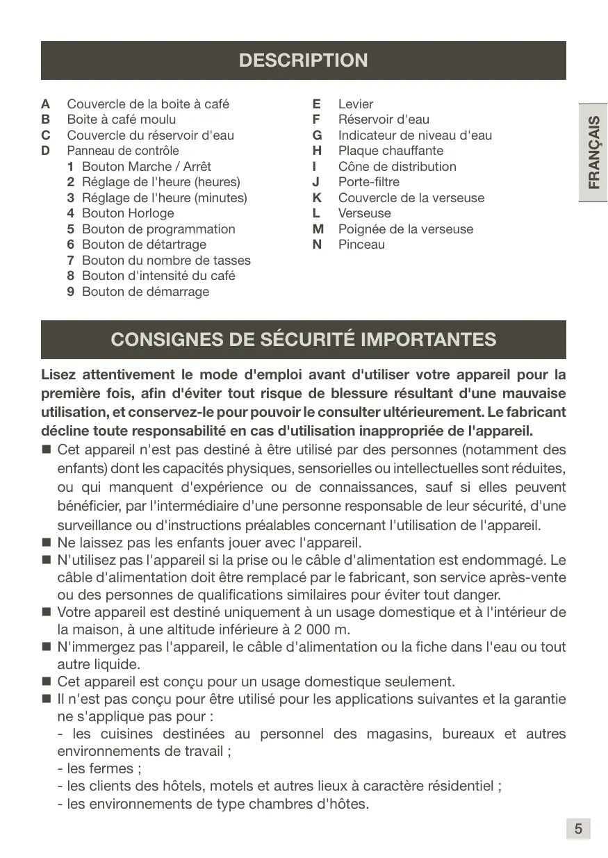 FRANÇAIS A B C D CONSIGNES DE SÉCURITÉ IMPORTANTES Lisez attentivement le mode d'emploi avant d'utiliser votre appareil pour la première fois, afin d'éviter tout risque de blessure résultant d'une mauvaise utilisation, et conservez-le pour pouvoir le consulter ultérieurement. Le fabricant décline toute responsabilité en cas d'utilisation inappropriée de l'appareil.
