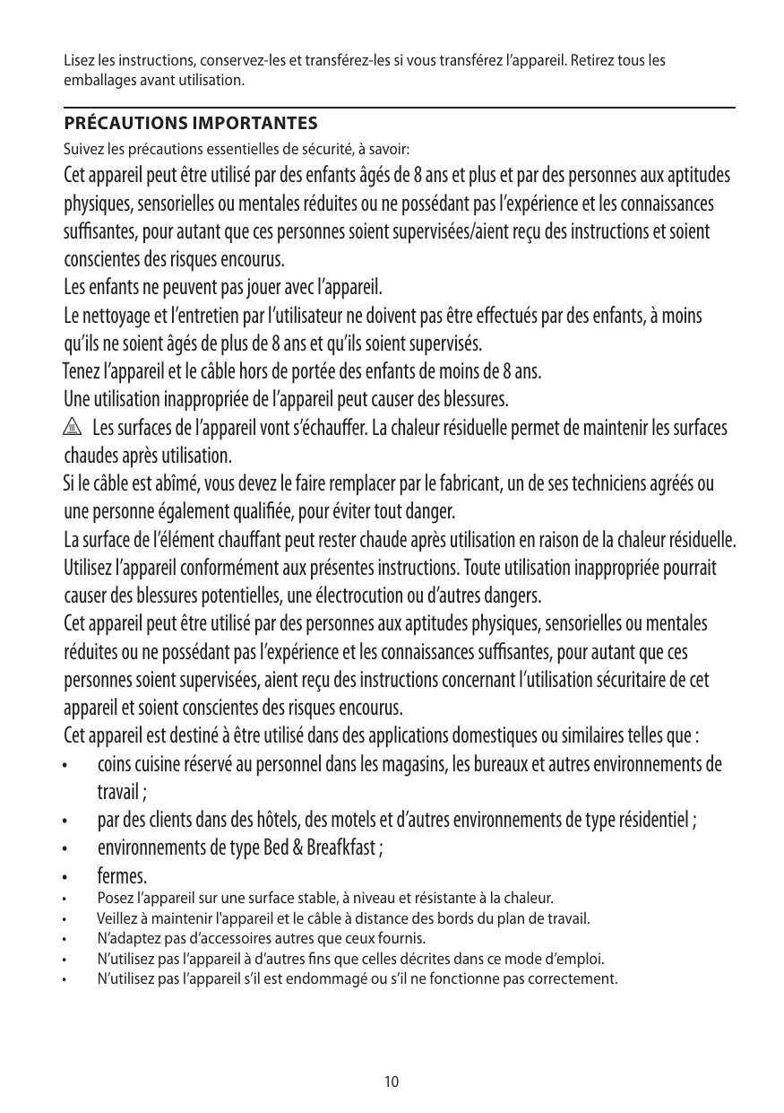 Les enfants ne peuvent pas jouer avec l’appareil. Le nettoyage et l’entretien par l’utilisateur ne doivent pas être effectués par des enfants, à moins qu’ils ne soient âgés de plus de 8 ans et qu’ils soient supervisés. Tenez l’appareil et le câble hors de portée des enfants de moins de 8 ans. Une utilisation inappropriée de l’appareil peut causer des blessures. h Les surfaces de l’appareil vont s’échauffer. La chaleur résiduelle permet de maintenir les surfaces chaudes après utilisation. Si le câble est abîmé, vous devez le faire remplacer par le fabricant, un de ses techniciens agréés ou une personne également qualifiée, pour éviter tout danger. La surface de l’élément chauffant peut rester chaude après utilisation en raison de la chaleur résiduelle. Utilisez l’appareil conformément aux présentes instructions. Toute utilisation inappropriée pourrait causer des blessures potentielles, une électrocution ou d’autres dangers. Cet appareil peut être utilisé par des personnes aux aptitudes physiques, sensorielles ou mentales réduites ou ne possédant pas l’expérience et les connaissances suffisantes, pour autant que ces personnes soient supervisées, aient reçu des instructions concernant l’utilisation sécuritaire de cet appareil et soient conscientes des risques encourus. Cet appareil est destiné à être utilisé dans des applications domestiques ou similaires telles que : • coins cuisine réservé au personnel dans les magasins, les bureaux et autres environnements de travail ; • par des clients dans des hôtels, des motels et d’autres environnements de type résidentiel ; • environnements de type Bed & Breafkfast ; • fermes. • • • • •