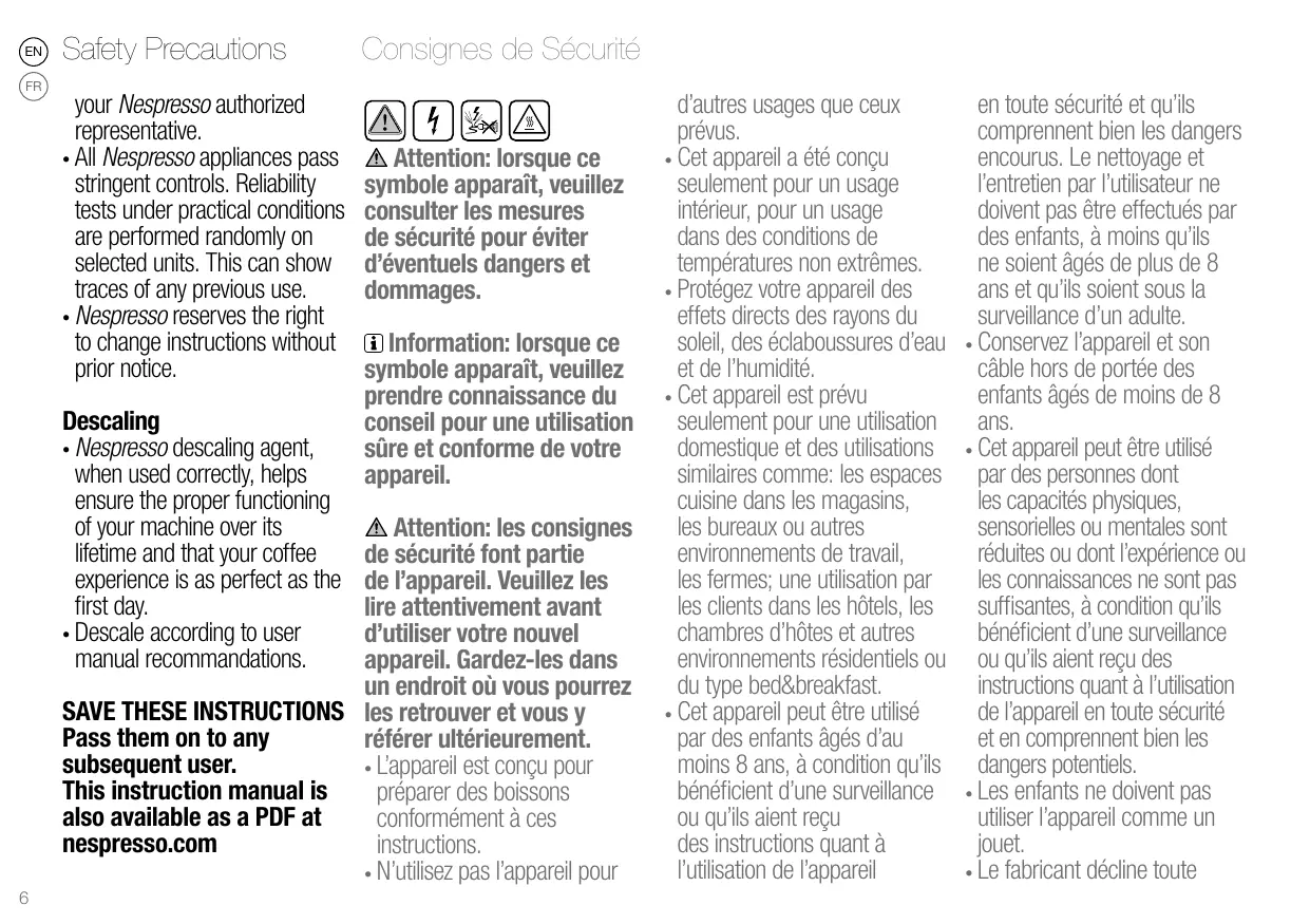 SAVE THESE INSTRUCTIONS les retrouver et vous y Pass them on to any référer ultérieurement. subsequent user. •• L’appareil est conçu pour This instruction manual is préparer des boissons also available as a PDF at conformément à ces nespresso.com instructions. •• N’utilisez pas l’appareil pour