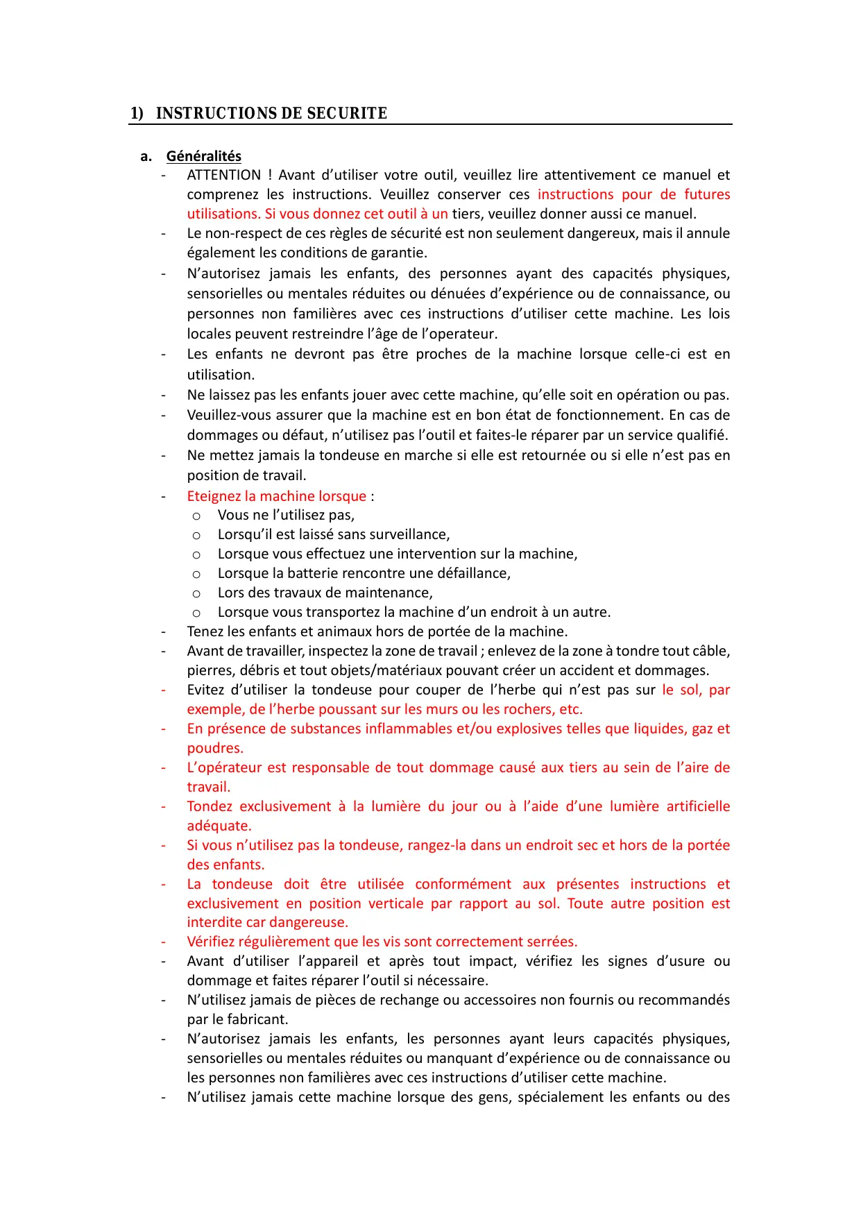 a. Généralités - ATTENTION ! Avant d’utiliser votre outil, veuillez lire attentivement ce manuel et comprenez les instructions. Veuillez conserver ces instructions pour de futures utilisations. Si vous donnez cet outil à un tiers, veuillez donner aussi ce manuel. - Le non-respect de ces règles de sécurité est non seulement dangereux, mais il annule également les conditions de garantie. - N’autorisez jamais les enfants, des personnes ayant des capacités physiques, sensorielles ou mentales réduites ou dénuées d’expérience ou de connaissance, ou personnes non familières avec ces instructions d’utiliser cette machine. Les lois locales peuvent restreindre l’âge de l’operateur. - Les enfants ne devront pas être proches de la machine lorsque celle-ci est en utilisation. - Ne laissez pas les enfants jouer avec cette machine, qu’elle soit en opération ou pas. - Veuillez-vous assurer que la machine est en bon état de fonctionnement. En cas de dommages ou défaut, n’utilisez pas l’outil et faites-le réparer par un service qualifié. - Ne mettez jamais la tondeuse en marche si elle est retournée ou si elle n’est pas en position de travail. - Eteignez la machine lorsque : o Vous ne l’utilisez pas, o Lorsqu’il est laissé sans surveillance, o Lorsque vous effectuez une intervention sur la machine, o Lorsque la batterie rencontre une défaillance, o Lors des travaux de maintenance, o Lorsque vous transportez la machine d’un endroit à un autre. - Tenez les enfants et animaux hors de portée de la machine. - Avant de travailler, inspectez la zone de travail ; enlevez de la zone à tondre tout câble, pierres, débris et tout objets/matériaux pouvant créer un accident et dommages. - Evitez d’utiliser la tondeuse pour couper de l’herbe qui n’est pas sur le sol, par exemple, de l’herbe poussant sur les murs ou les rochers, etc. - En présence de substances inflammables et/ou explosives telles que liquides, gaz et poudres. - L’opérateur est responsable de tout dommage causé aux tiers au sein de l’aire de travail. - Tondez exclusivement à la lumière du jour ou à l’aide d’une lumière artificielle adéquate. - Si vous n’utilisez pas la tondeuse, rangez-la dans un endroit sec et hors de la portée des enfants. - La tondeuse doit être utilisée conformément aux présentes instructions et exclusivement en position verticale par rapport au sol. Toute autre position est interdite car dangereuse. - Vérifiez régulièrement que les vis sont correctement serrées. - Avant d’utiliser l’appareil et après tout impact, vérifiez les signes d’usure ou dommage et faites réparer l’outil si nécessaire. - N’utilisez jamais de pièces de rechange ou accessoires non fournis ou recommandés par le fabricant. - N’autorisez jamais les enfants, les personnes ayant leurs capacités physiques, sensorielles ou mentales réduites ou manquant d’expérience ou de connaissance ou les personnes non familières avec ces instructions d’utiliser cette machine. - N’utilisez jamais cette machine lorsque des gens, spécialement les enfants ou des