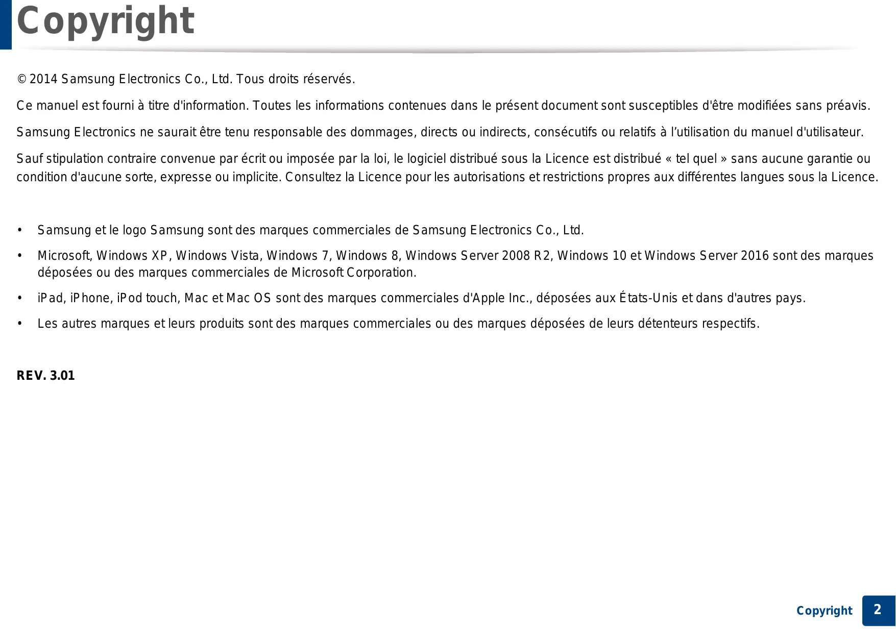 Copyright © 2014 Samsung Electronics Co., Ltd. Tous droits réservés. Ce manuel est fourni à titre d'information. Toutes les informations contenues dans le présent document sont susceptibles d'être modifiées sans préavis. Samsung Electronics ne saurait être tenu responsable des dommages, directs ou indirects, consécutifs ou relatifs à l’utilisation du manuel d'utilisateur. Sauf stipulation contraire convenue par écrit ou imposée par la loi, le logiciel distribué sous la Licence est distribué « tel quel » sans aucune garantie ou condition d'aucune sorte, expresse ou implicite. Consultez la Licence pour les autorisations et restrictions propres aux différentes langues sous la Licence.