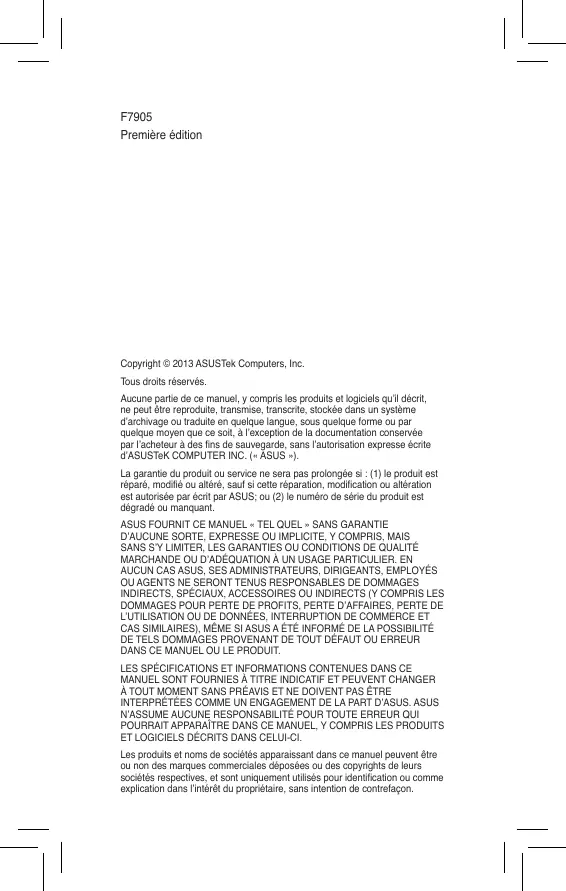 Copyright © 2013 ASUSTek Computers, Inc. Tous droits réservés. Aucune partie de ce manuel, y compris les produits et logiciels qu’il décrit, ne peut être reproduite, transmise, transcrite, stockée dans un système d’archivage ou traduite en quelque langue, sous quelque forme ou par quelque moyen que ce soit, à l’exception de la documentation conservée par l’acheteur à des fins de sauvegarde, sans l’autorisation expresse écrite d’ASUSTeK COMPUTER INC. (« ASUS »). La garantie du produit ou service ne sera pas prolongée si : (1) le produit est réparé, modifié ou altéré, sauf si cette réparation, modification ou altération est autorisée par écrit par ASUS; ou (2) le numéro de série du produit est dégradé ou manquant. ASUS FOURNIT CE MANUEL « TEL QUEL » SANS GARANTIE D’AUCUNE SORTE, EXPRESSE OU IMPLICITE, Y COMPRIS, MAIS SANS S’Y LIMITER, LES GARANTIES OU CONDITIONS DE QUALITÉ MARCHANDE OU D’ADÉQUATION À UN USAGE PARTICULIER. EN AUCUN CAS ASUS, SES ADMINISTRATEURS, DIRIGEANTS, EMPLOYÉS OU AGENTS NE SERONT TENUS RESPONSABLES DE DOMMAGES INDIRECTS, SPÉCIAUX, ACCESSOIRES OU INDIRECTS (Y COMPRIS LES DOMMAGES POUR PERTE DE PROFITS, PERTE D’AFFAIRES, PERTE DE L’UTILISATION OU DE DONNÉES, INTERRUPTION DE COMMERCE ET CAS SIMILAIRES), MÊME SI ASUS A ÉTÉ INFORMÉ DE LA POSSIBILITÉ DE TELS DOMMAGES PROVENANT DE TOUT DÉFAUT OU ERREUR DANS CE MANUEL OU LE PRODUIT. LES SPÉCIFICATIONS ET INFORMATIONS CONTENUES DANS CE MANUEL SONT FOURNIES À TITRE INDICATIF ET PEUVENT CHANGER À TOUT MOMENT SANS PRÉAVIS ET NE DOIVENT PAS ÊTRE INTERPRÉTÉES COMME UN ENGAGEMENT DE LA PART D’ASUS. ASUS N’ASSUME AUCUNE RESPONSABILITÉ POUR TOUTE ERREUR QUI POURRAIT APPARAÎTRE DANS CE MANUEL, Y COMPRIS LES PRODUITS ET LOGICIELS DÉCRITS DANS CELUI-CI. Les produits et noms de sociétés apparaissant dans ce manuel peuvent être ou non des marques commerciales déposées ou des copyrights de leurs sociétés respectives, et sont uniquement utilisés pour identification ou comme explication dans l’intérêt du propriétaire, sans intention de contrefaçon.