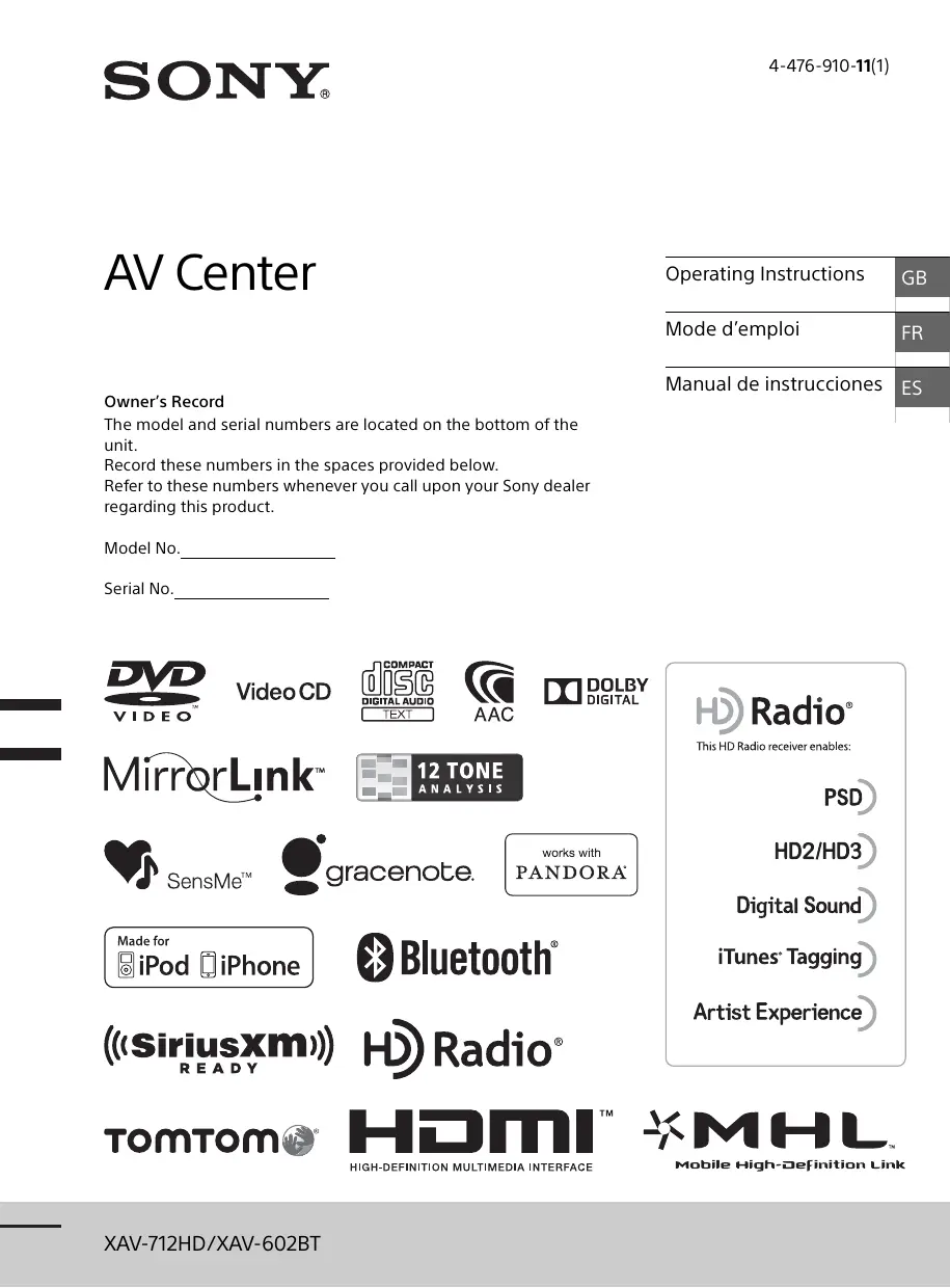 À propos de ce mode d’emploi Ce mode d’emploi contient des instructions pour les modèles XAV-712HD et XAV-602BT. Le modèle XAV-602BT est utilisé à titre de référence dans les illustrations.