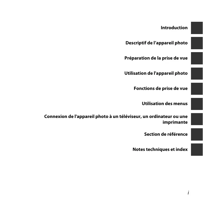 Manuel de référence Imprimé en Chine CT3L01(13) 6MN32813-01 Introduction Descriptif de l’appareil photo Préparation de la prise de vue Utilisation de l'appareil photo Fonctions de prise de vue Utilisation des menus Connexion de l'appareil photo à un téléviseur, un ordinateur ou une imprimante Section de référence Notes techniques et index